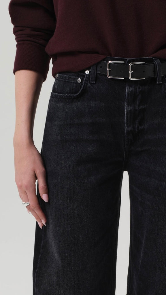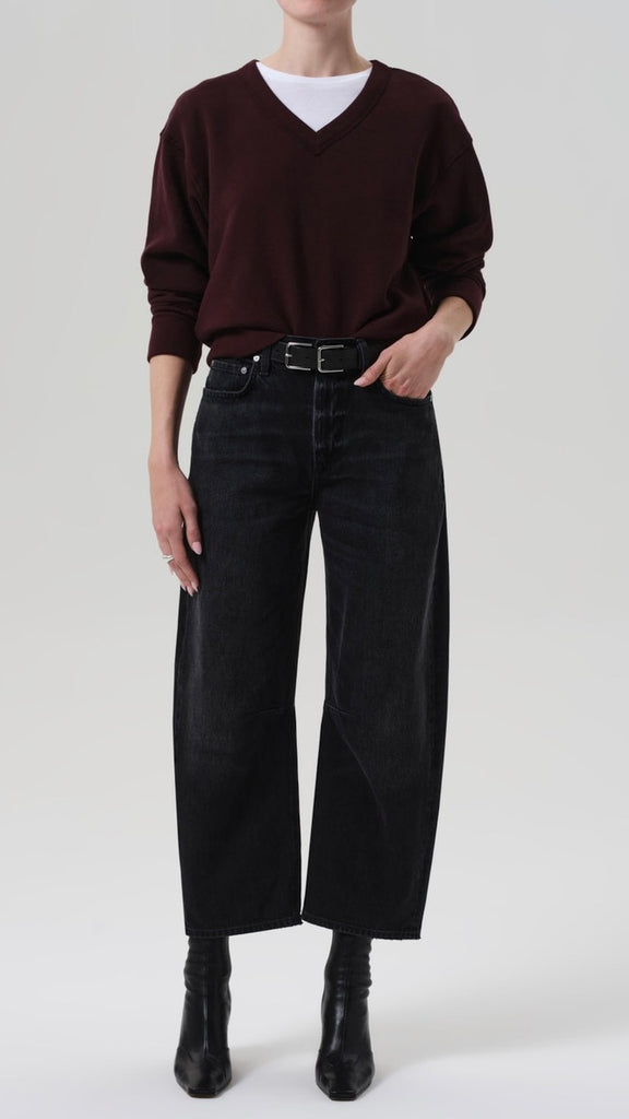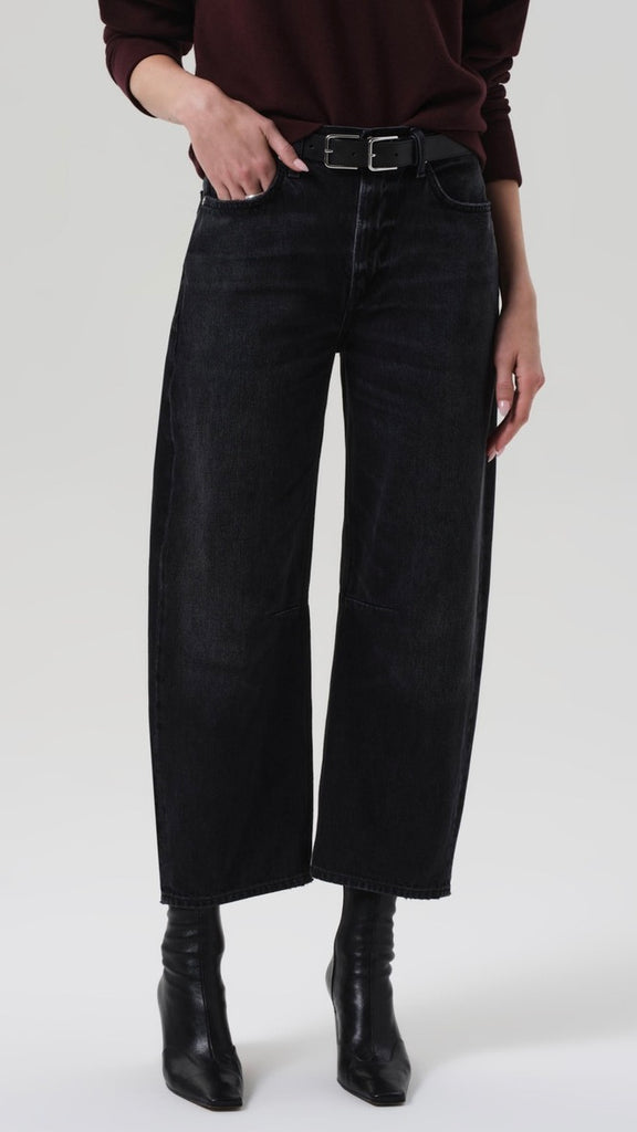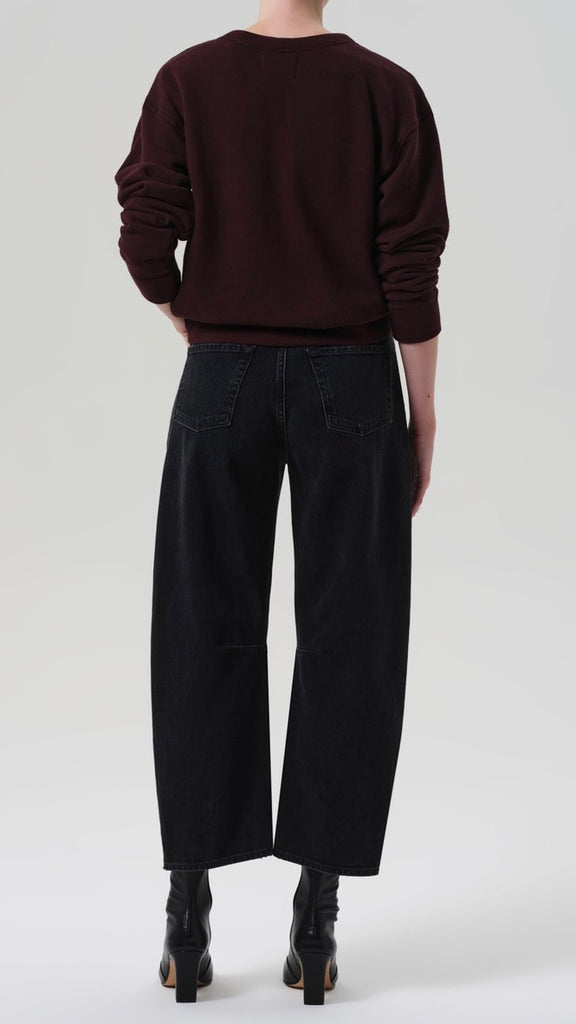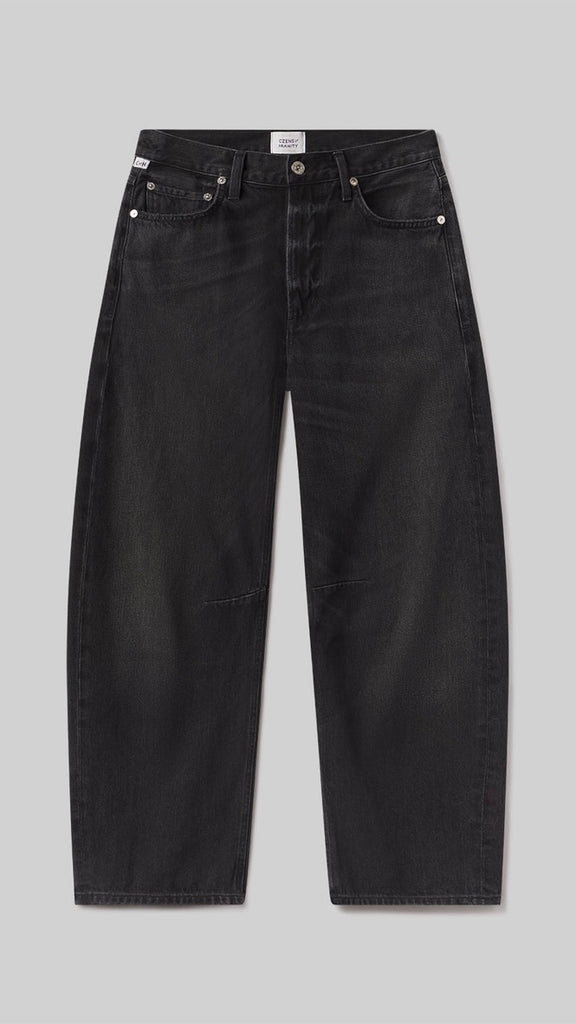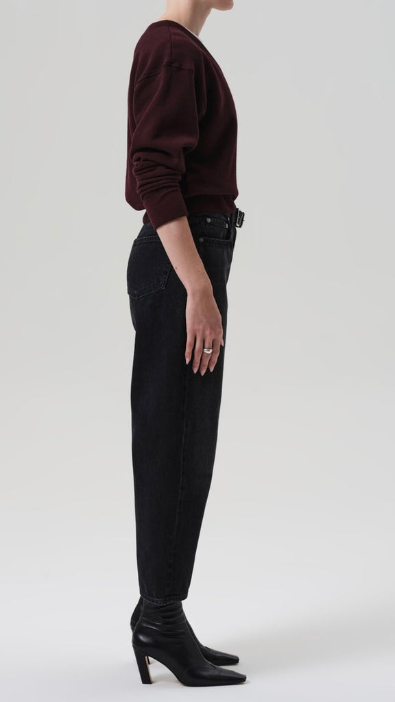 The ‘Miro’ is a subtle take on the barrel silhouette, cut with a relaxed taper and high rise for a modern yet easy fit. Crafted from rigid regenerative cotton with a soft, broken-in feel, the washed black denim features nuanced fading and marbling for a worn-in look. A versatile option that works with anything from sharp shirting to laid-back layers—finished with a clean ankle-length hem to suit any shoe.