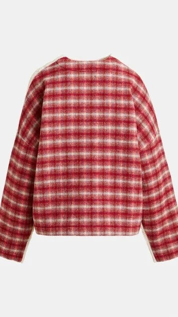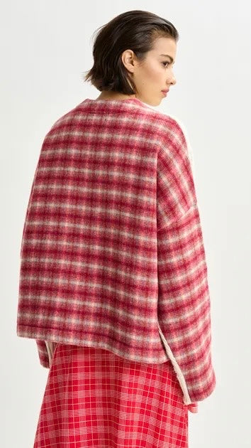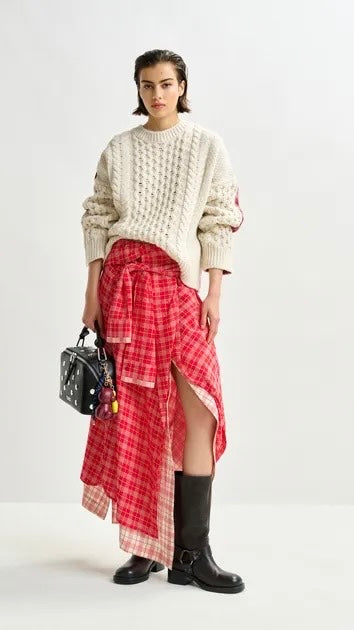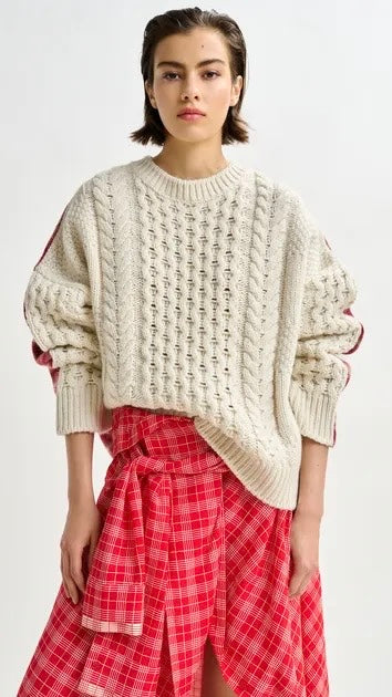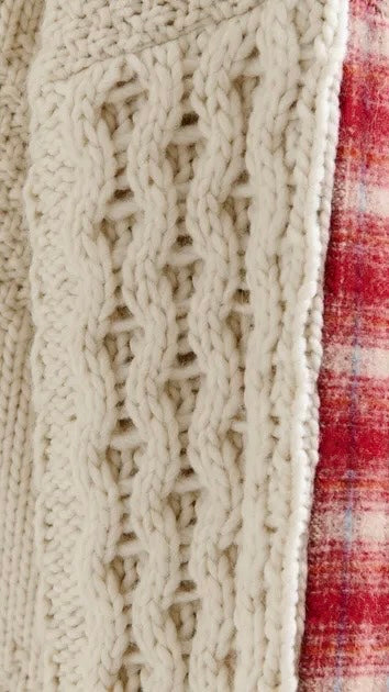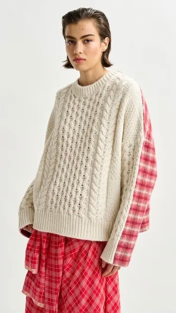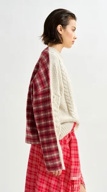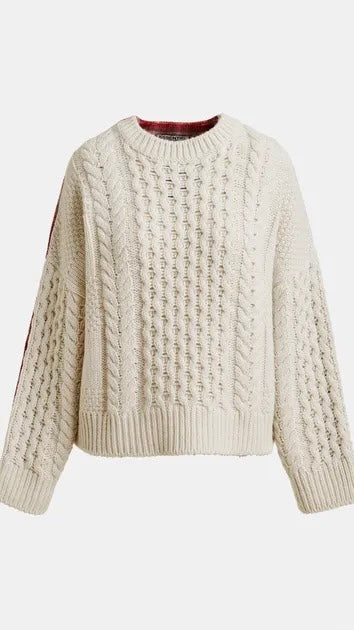 This sweater reimagines traditional knitwear with an unexpected twist. The front is textured in a classic cable-knit design, while the back reveals a checked wool panel. Made in Italy, the wool-blend body delivers warmth, while the relaxed silhouette and boxy fit ensure ease and comfort.