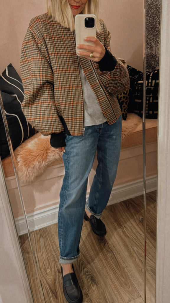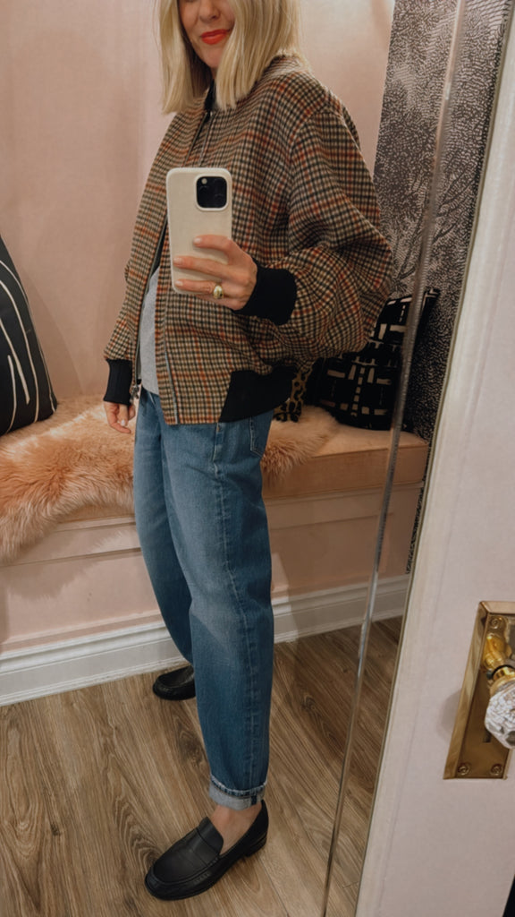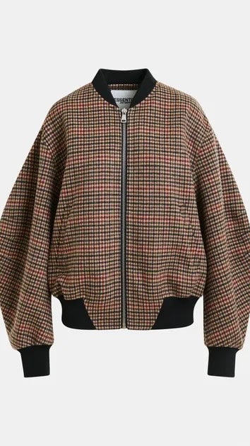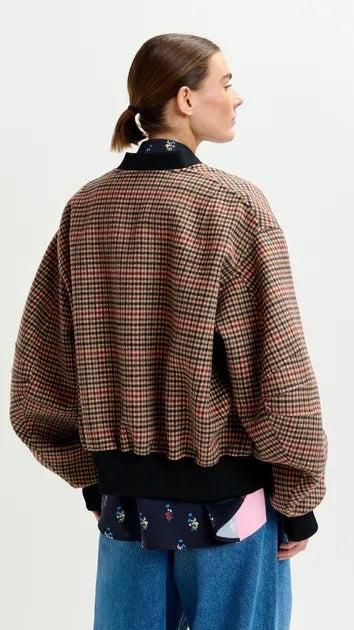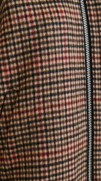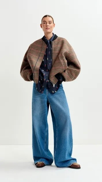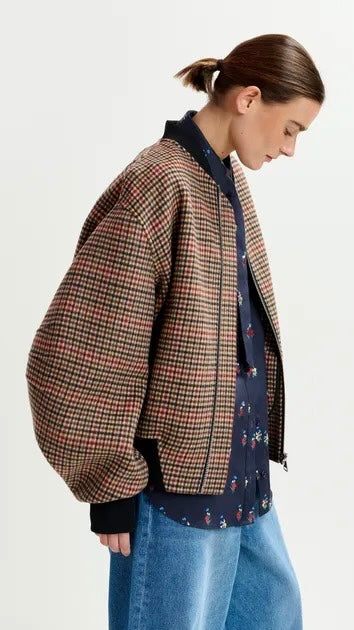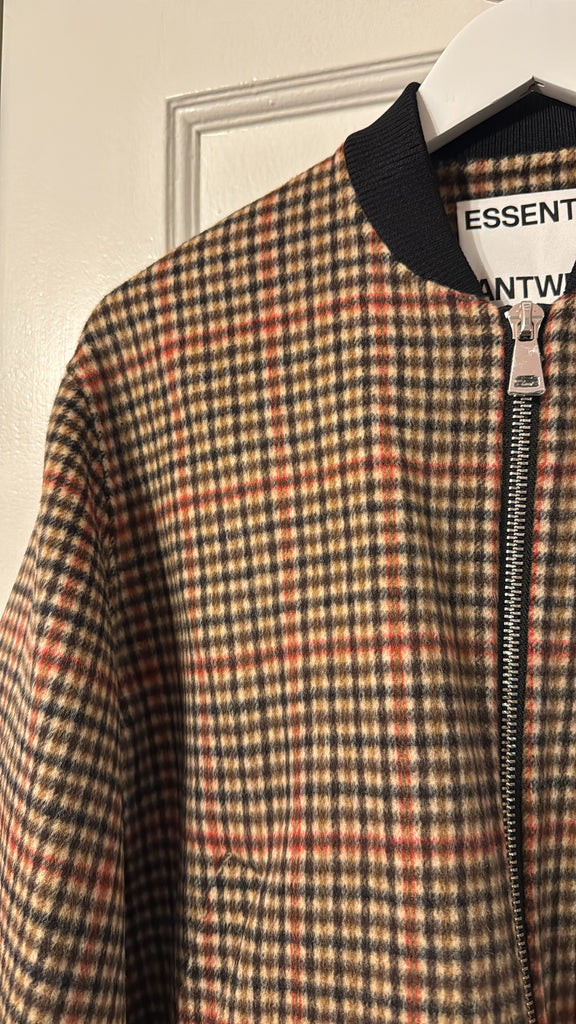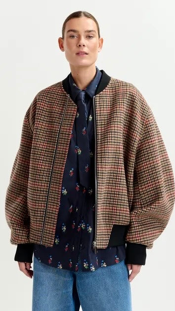 This bomber is crafted from 100% wool and is designed for an oversized fit. It features a full zip fastening, dropped shoulders, and slanted side pockets. This wool fabric showcases a bold check pattern, adding texture and visual interest to this contemporary outerwear piece.