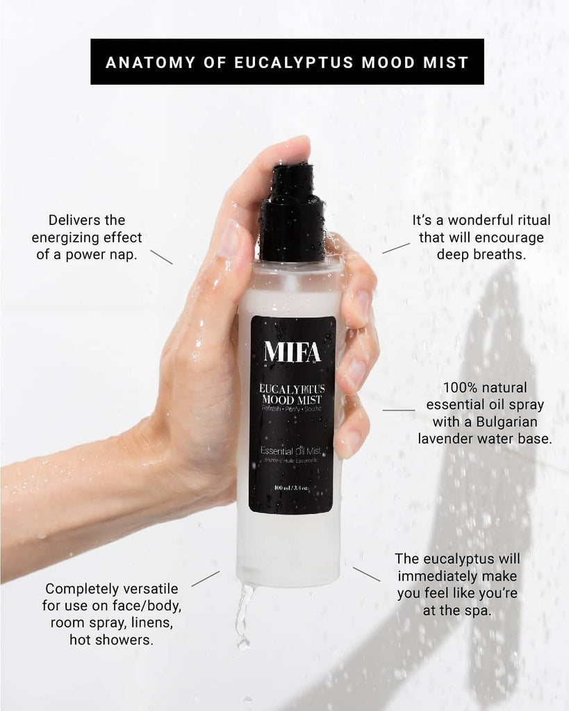 MIFA’s 100% natural essential oil spray, EUCALYPTUS MOOD MIST, is a versatile essential oil blend that is grounding, uplifting, and refreshing. Created to restore, refresh and reset your experience by encouraging daily connection to self, deep breathing and relaxation.