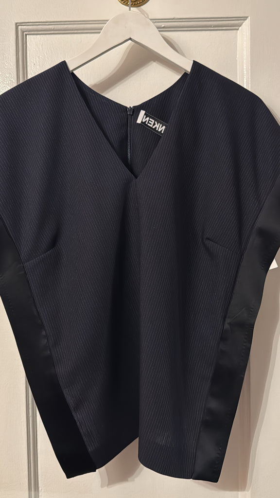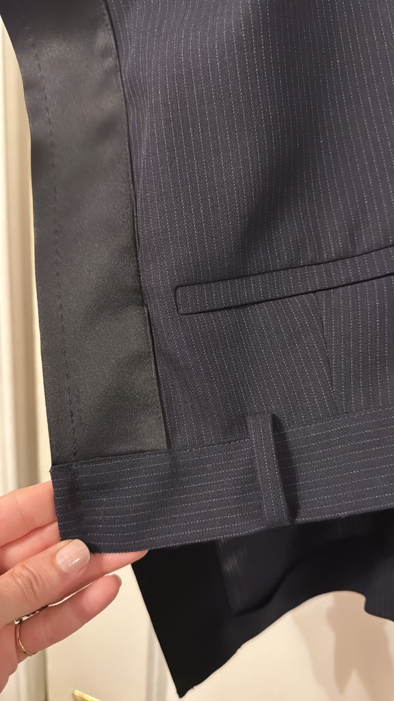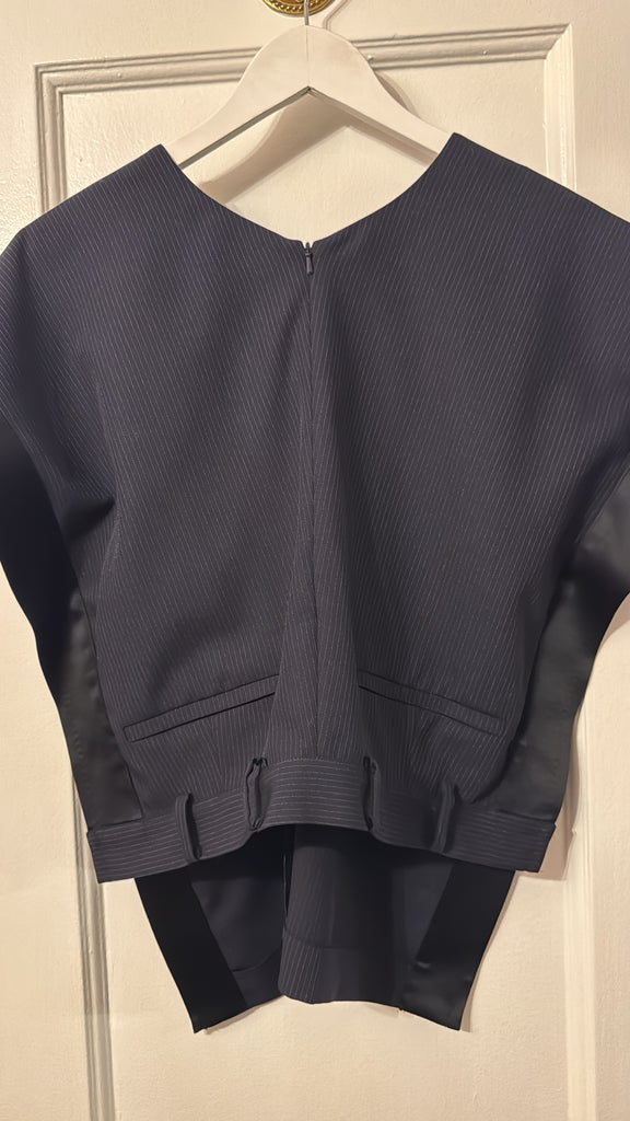 A bold reinterpretation of classic tailoring, this piece features a v-neckline at both the front and back, finished with an invisible zip for a clean, minimal look. The waistband, repositioned at the hem, evokes the structure of inverted trousers, creating an unexpected and sculptural silhouette. A glossy dark stripe runs along the outer edges, adding contrast and refinement to the navy pinstripe pattern. A refined fusion of deconstruction and precision.