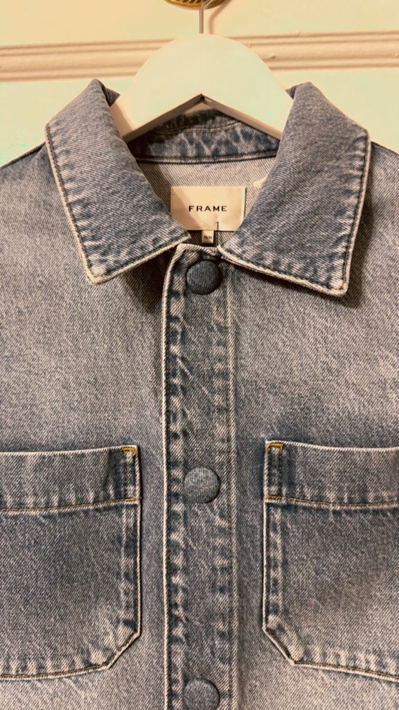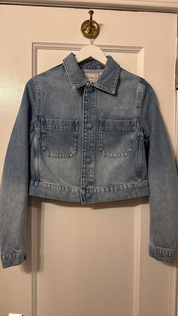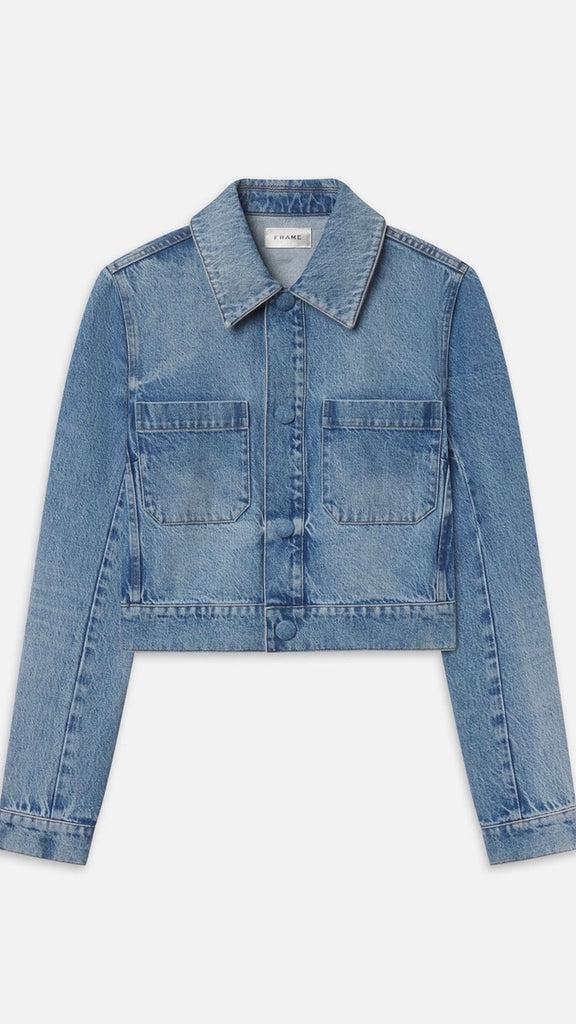 The Small Denim Jacket is made in crisp 100% cotton denim, featuring a cropped, boxy silhouette and self-covered snap closures along the front for a clean, modern finish.