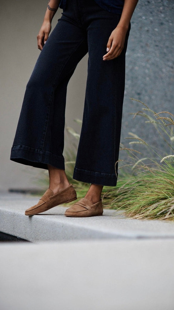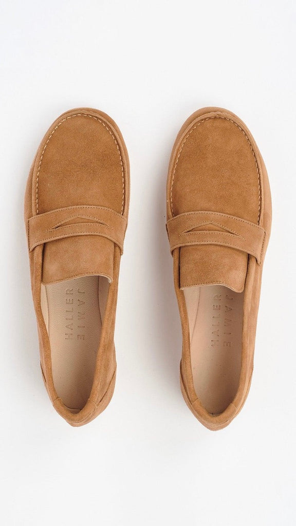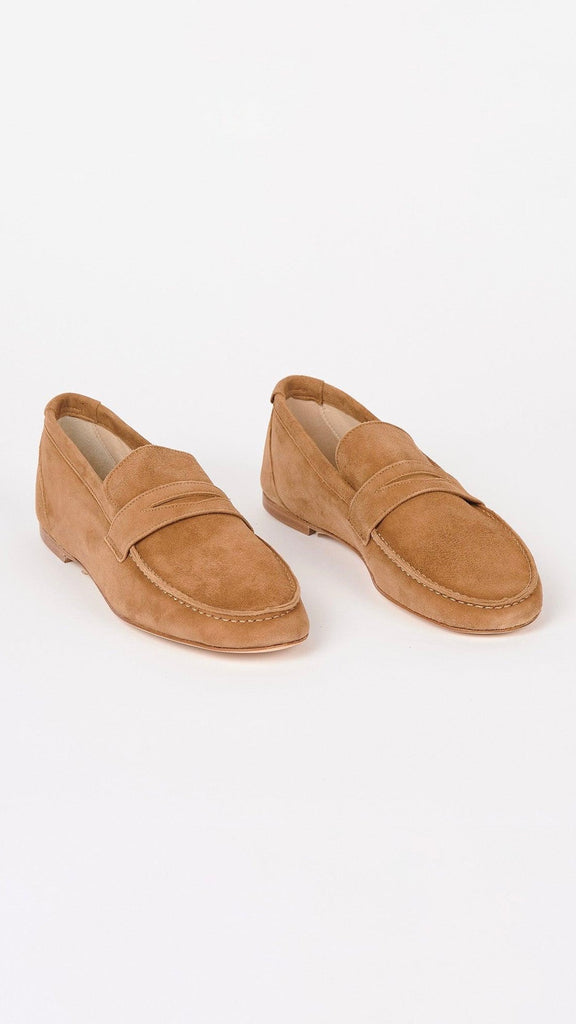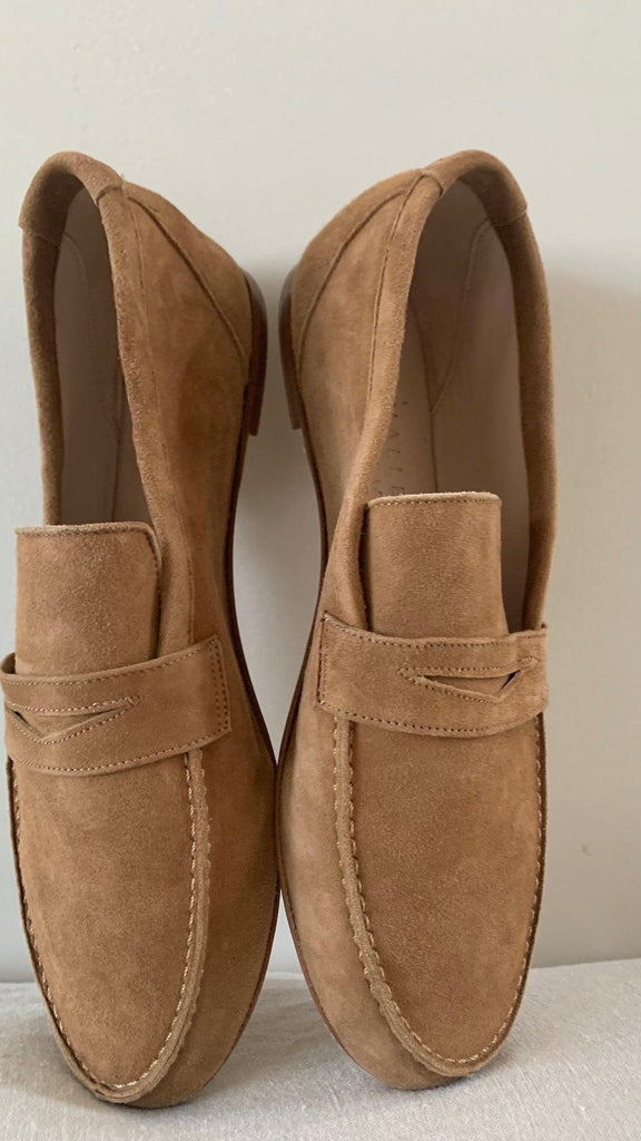 Jamie's signature Penny Loafer in Italian suede. Inspired by the handsome lines of a 70’s Italian mens loafer with the understated casual soul of a slipper. Old world Sacchetto construction for a glove like fit and buttery feel. Leather lined. Leather sole and insole. Rubber Injected Leather Sole.