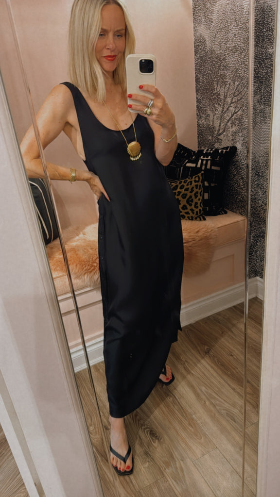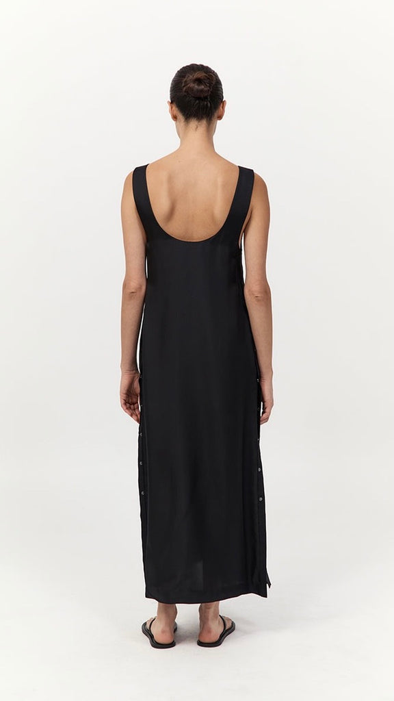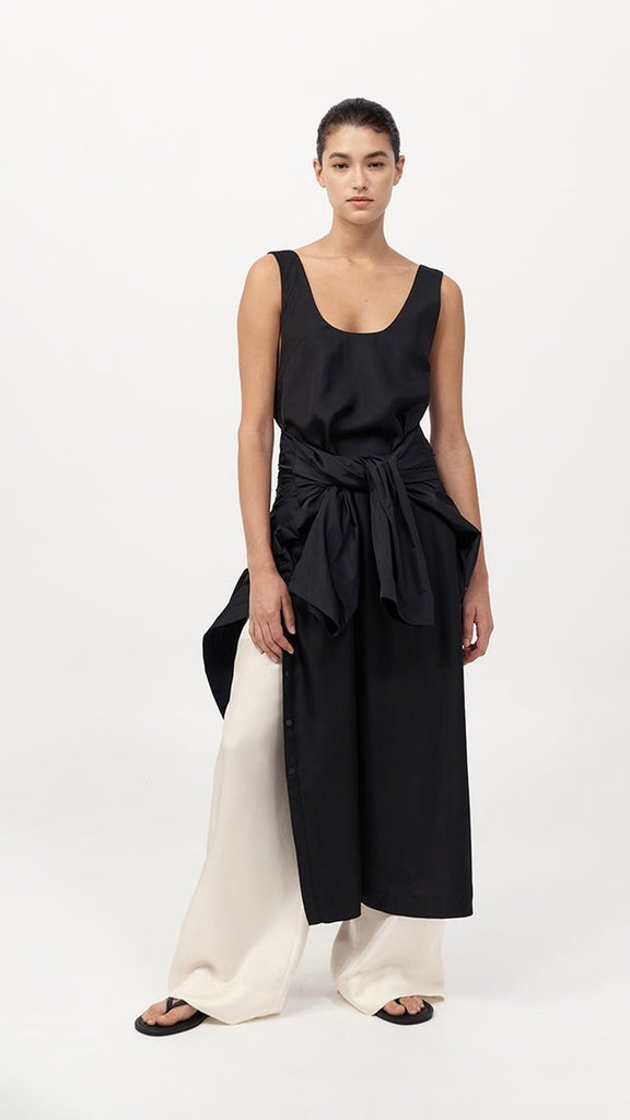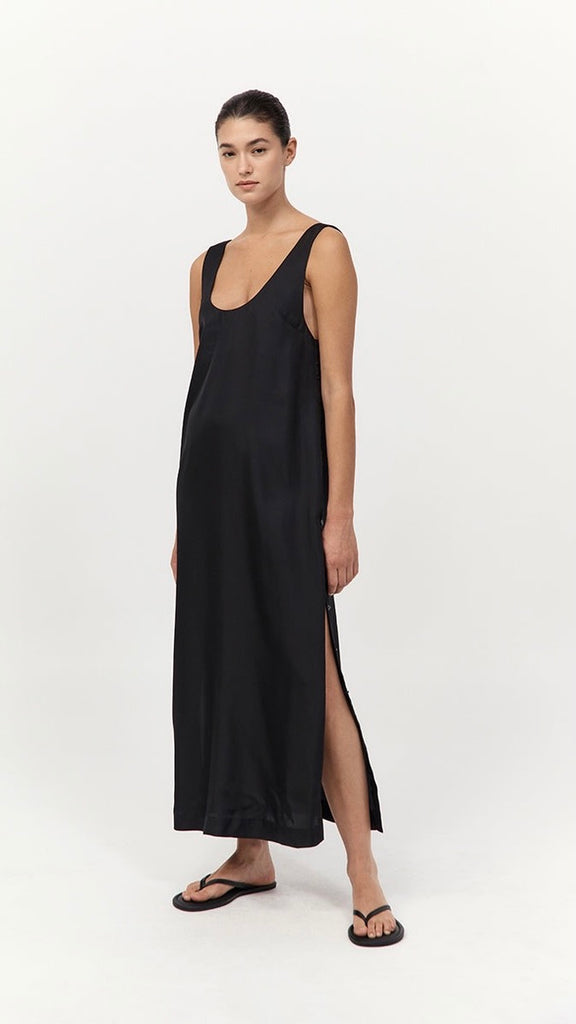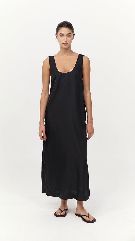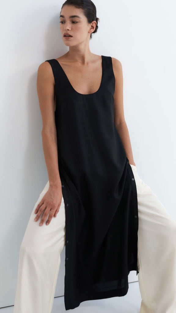 The Jordan Button Up Dress is a minimal silhouette elevated by its subtle detailing. Crafted in silk twill, it features a low scoop neckline and a buttoned split at the side seam for an athletic touch. Wear alone or layered over the Silk Twill Pants for an effortless ensemble.