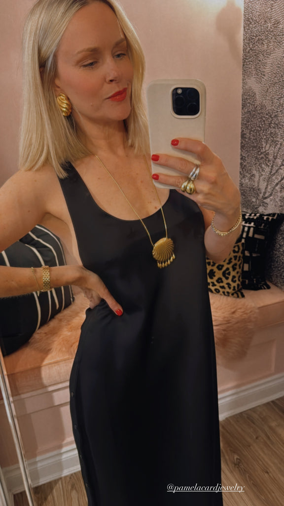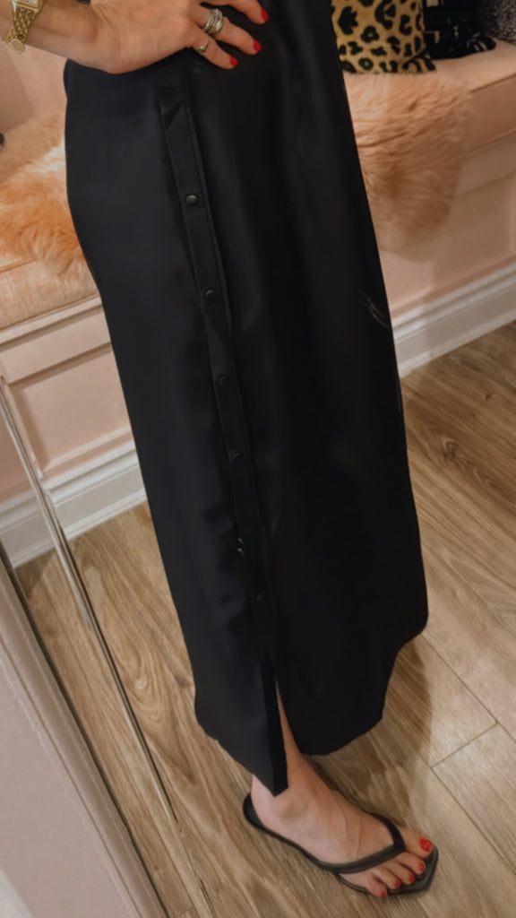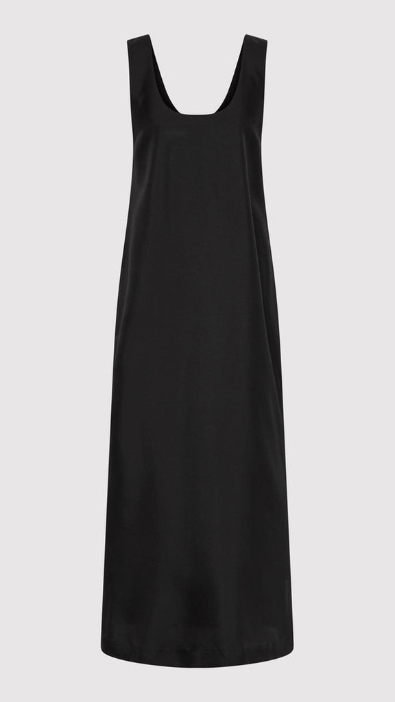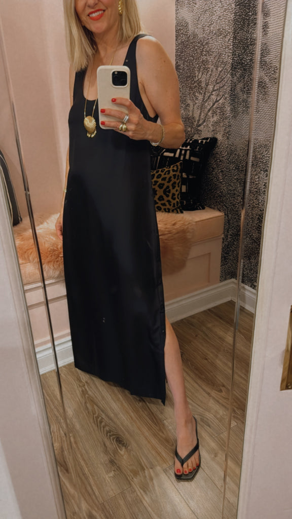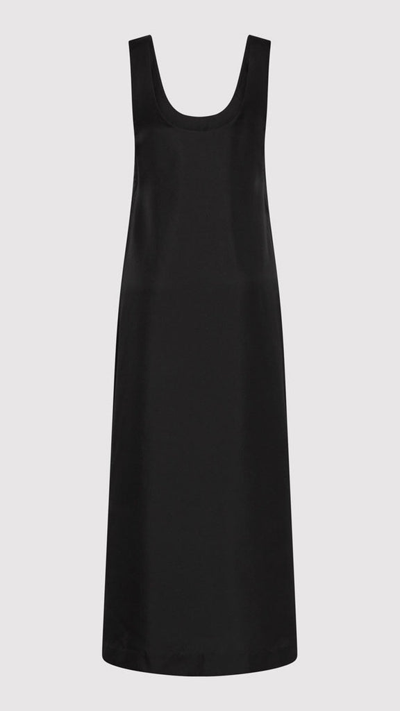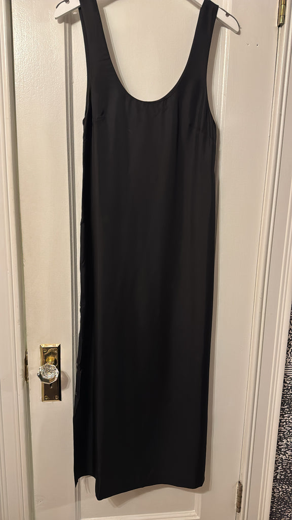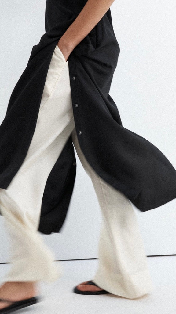 The Jordan Button Up Dress is a minimal silhouette elevated by its subtle detailing. Crafted in silk twill, it features a low scoop neckline and a buttoned split at the side seam for an athletic touch. Wear alone or layered over the Silk Twill Pants for an effortless ensemble.