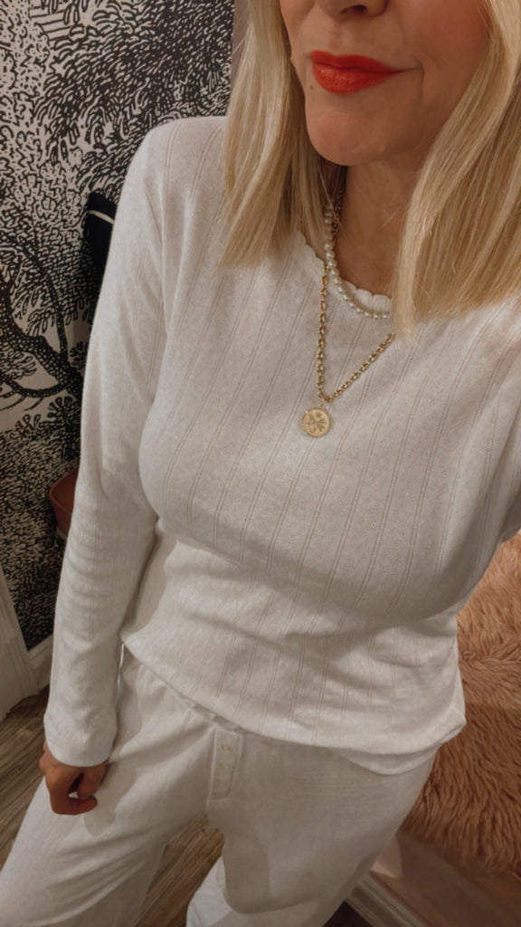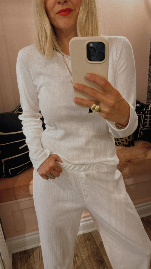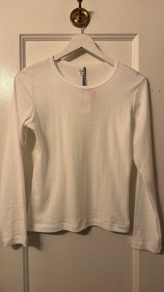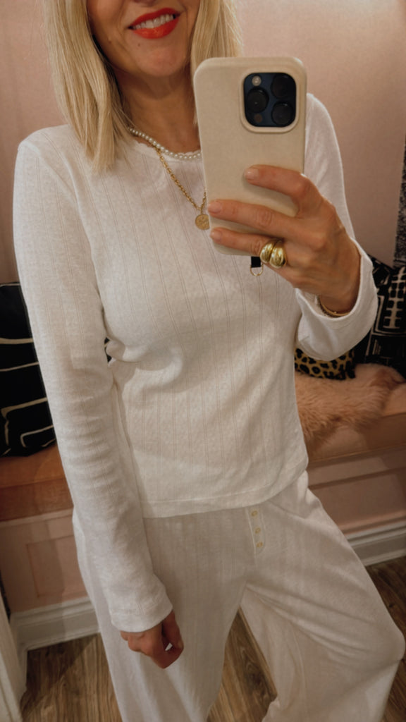 Cut in a nostalgic Pointelle Cotton, The Pointelle Slim Fit Long Sleeve features a classic crew neckline with our signature pinhole stripes, dainty eyelets, and scalloped edging. Full length with fitted long sleeves.