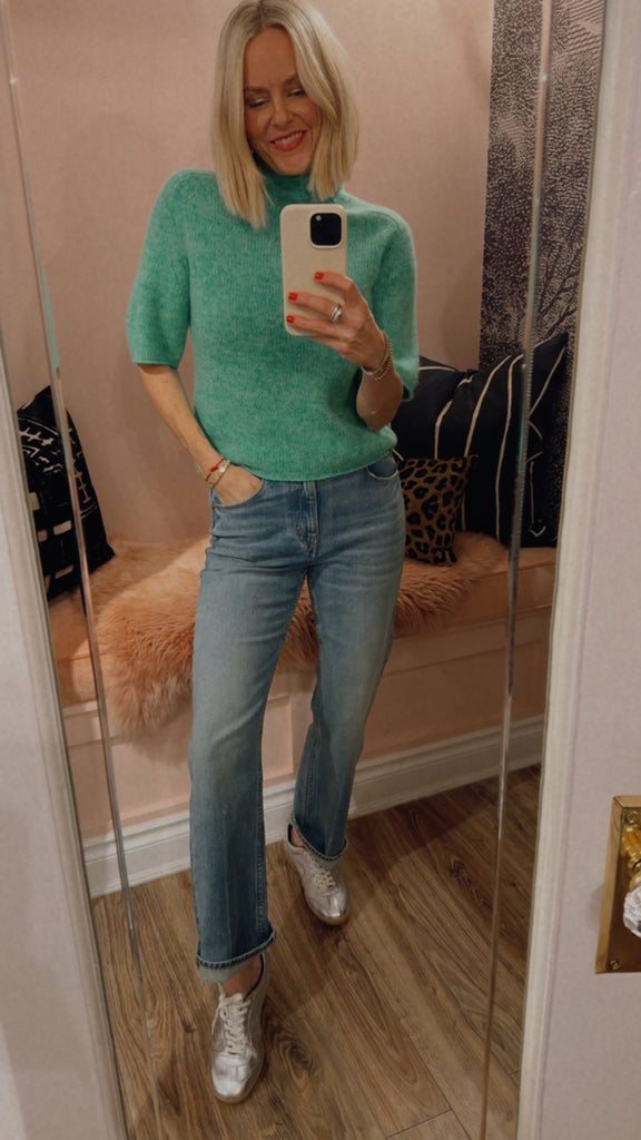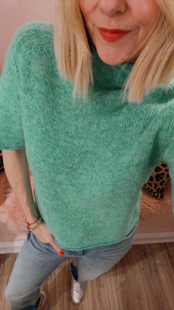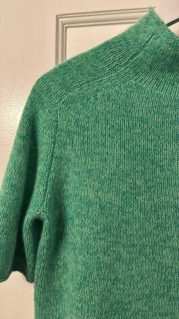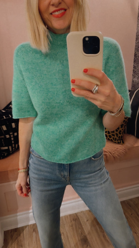 A transitional piece, the Fride sweater is crafted in our heavy knit, 5 gauge cashmere for a subtly textured feel. The regular fit, cropped silhouette has a standing mock neck, slim short sleeves and is finished with a rolled hem.