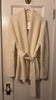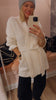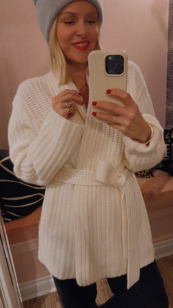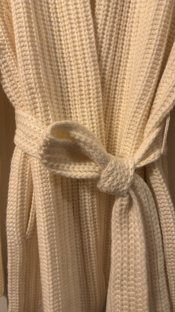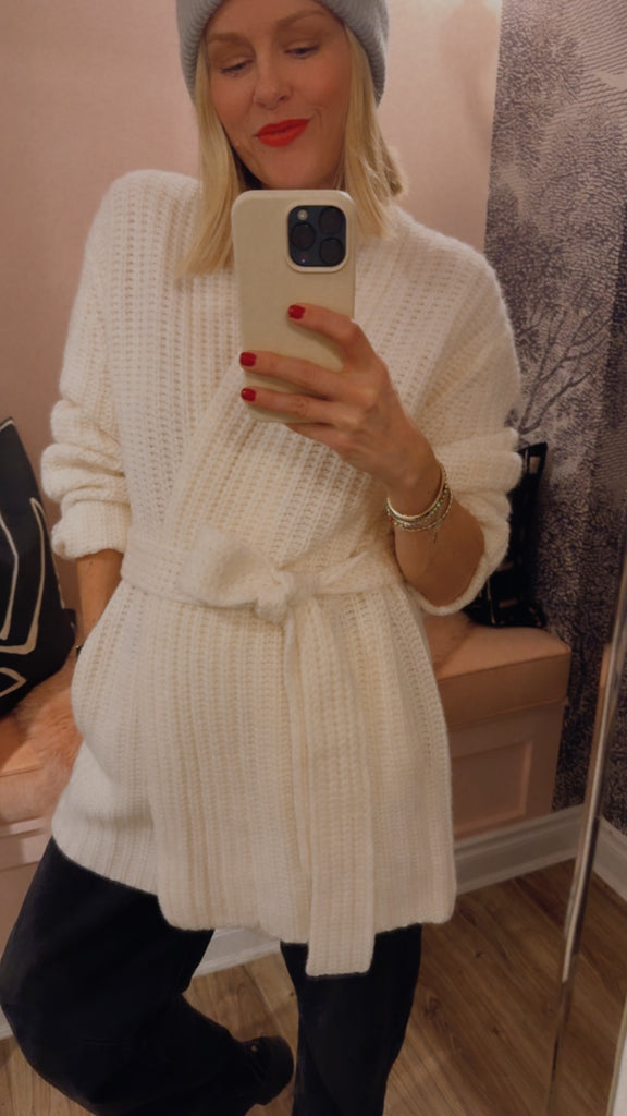 The Jacqueline cardigan features an open front shawl collar and a tie, in a loose enlarged rib knit.
