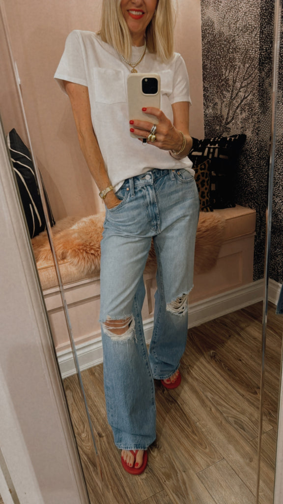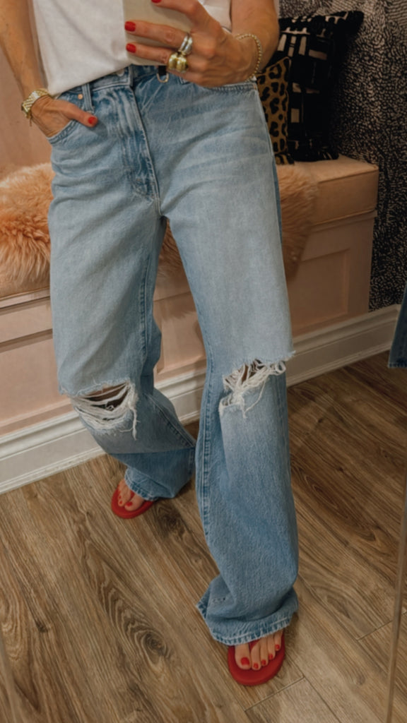 Field research. Jeans designed to sit on the hips with a zip fly, slouchy fit, loose straight leg and a 32-inch inseam with a clean hem. Made from rigid SUPERIOR denim, Floral Frenzy is a light blue with whiskering, fading and tears at the knees.