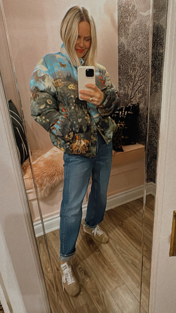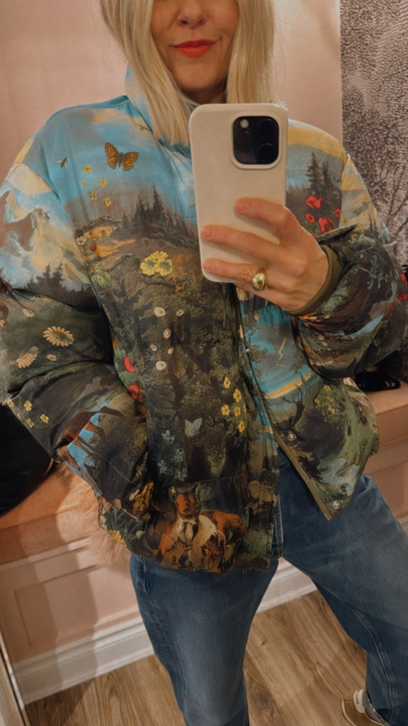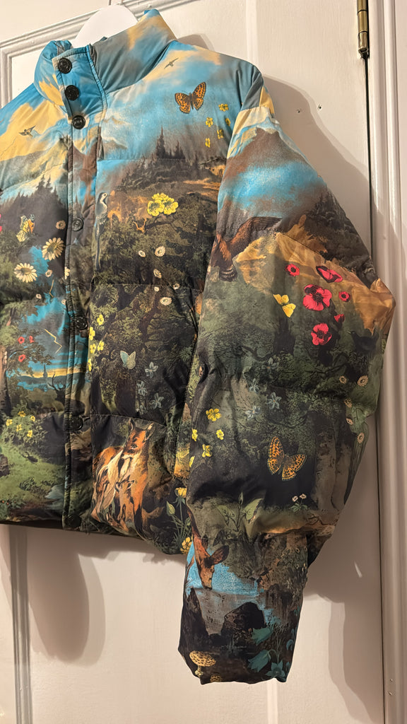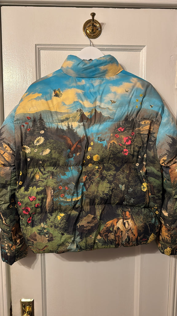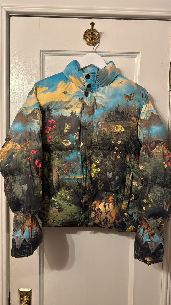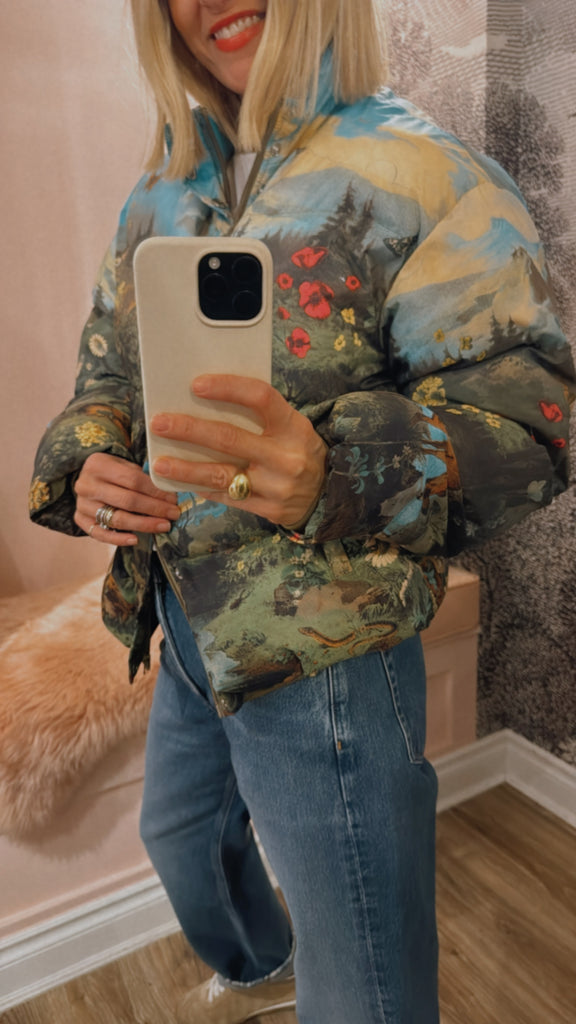 Scenic route. A classic puffer jacket with a high collar, zip and snap closure, slit pockets and a slightly cropped, boxy fit. Made from a quilted fabric, Room With A View features a colorful pastoral graphic.