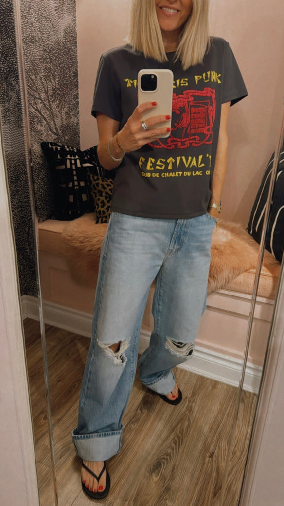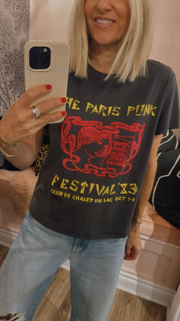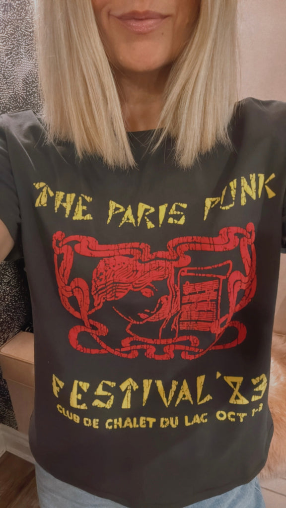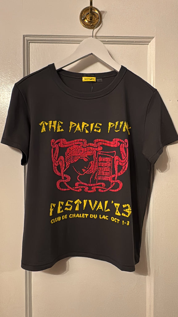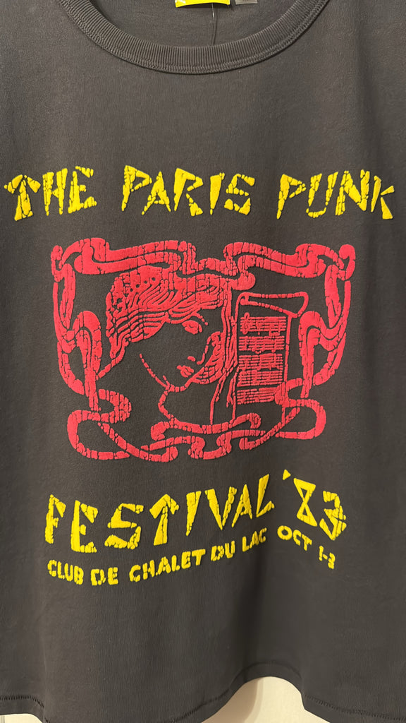 Voyou pour la vie. The Lil Goodie Goodie in Paris Punk is a soft, slightly sheer crewneck with a slim fit for a vintage look and feel. Made from 100% cotton, the faded black tee features a yellow and red text graphic inspired by a punk music festival.