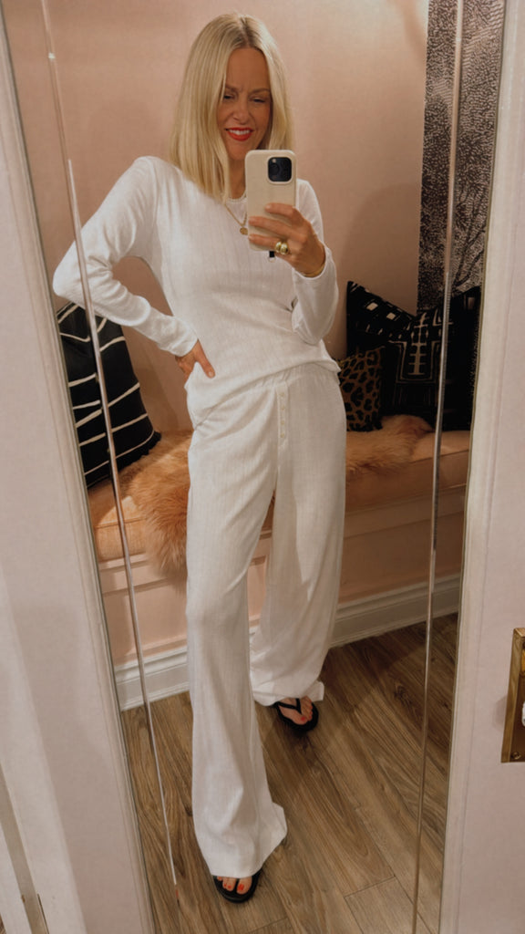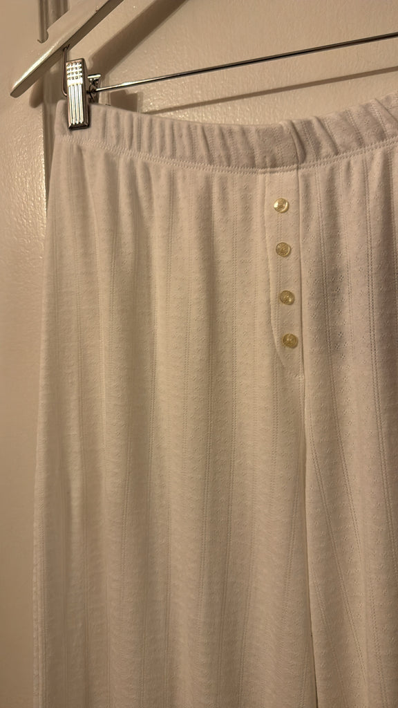 Cut in a nostalgic Pointelle Cotton, The Pointelle Boxer Pant is a wide leg silhouette featuring pinhole stripes, dainty eyelets, tonal henley buttons and a comfortable elasticized waistband that sits at the natural waist.
