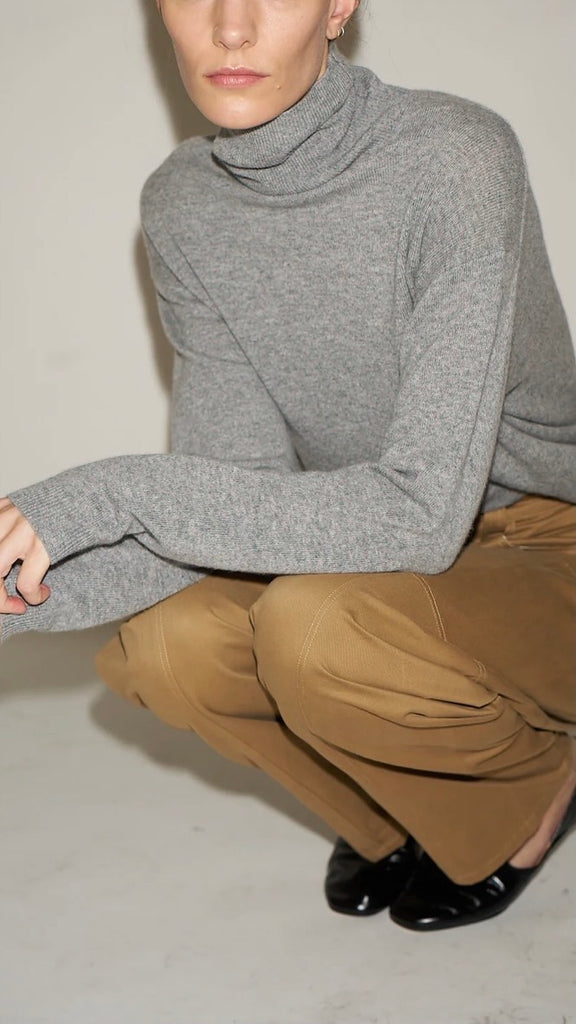 A slim elongated turtle neck with rib neck detail and a loose slouchy bodice in our tee shirt weight cashmere. Soft, washed cashmere in for a “like butter” hand feel that becomes a second skin. A lightweight rib waistband finishes the sweater. Soft and easy to tuck in.