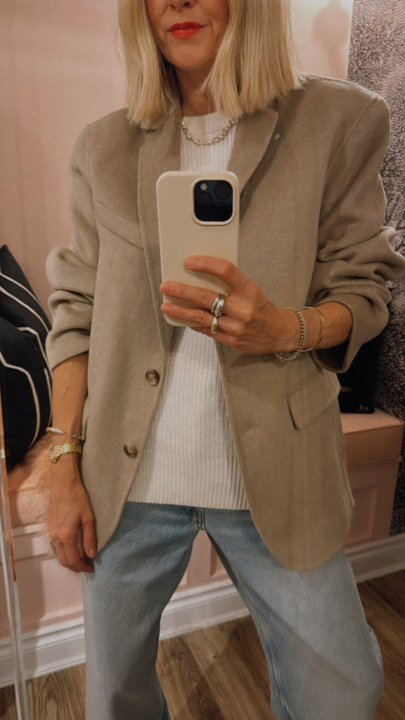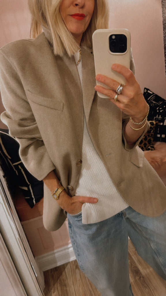 An unconstructed blazer made from a heavyweight, double-faced wool-cashmere blend, featuring a classic oversized fit, notched collar, and single-breasted closure with two buttons.