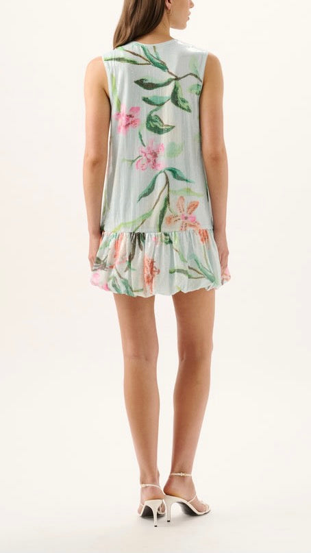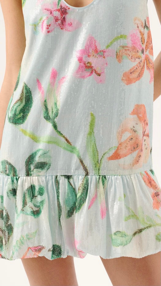 A playful take on evening dressing, the Bambi Sequin Mini Dress features Roame's exclusive Tucano print rendered in shimmering micro sequins. Designed in a flattering bubble silhouette with a low scoop neckline and drop waist, this mini is finished with a full, bubbled skirt for a statement yet polished look.