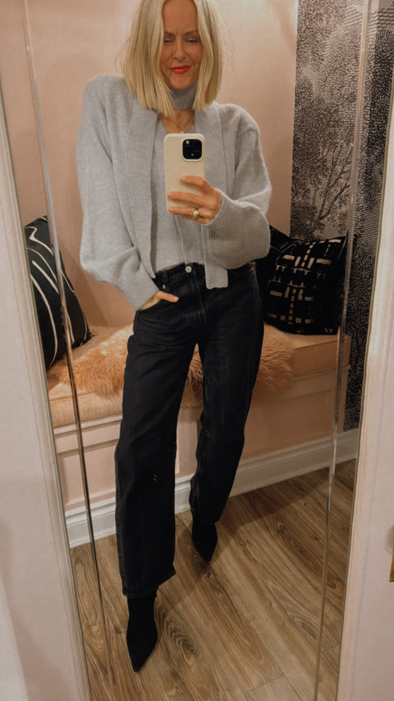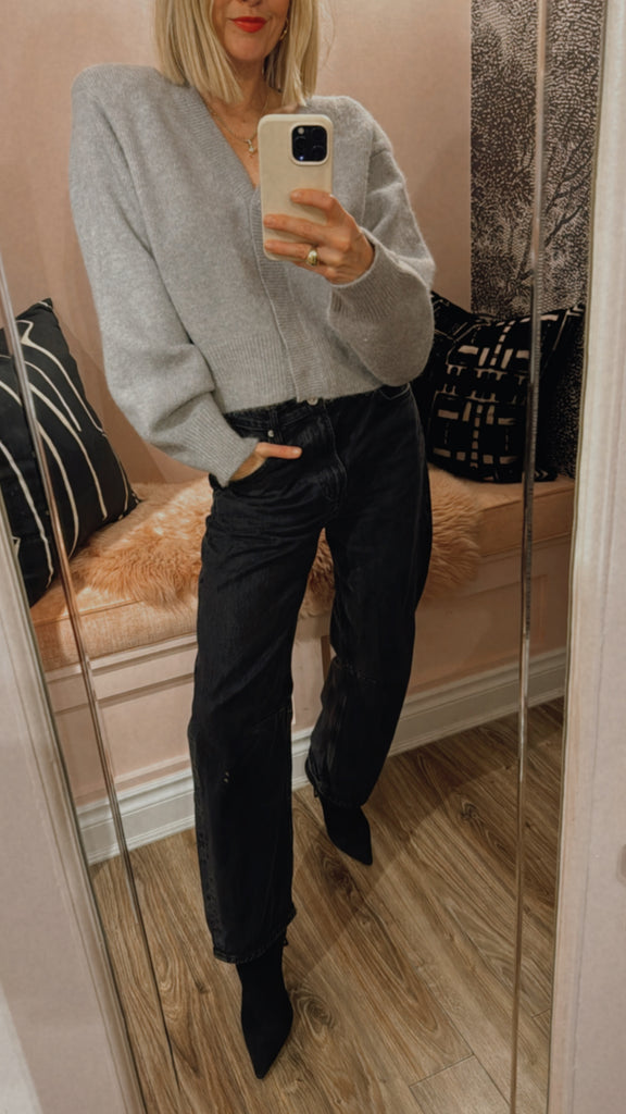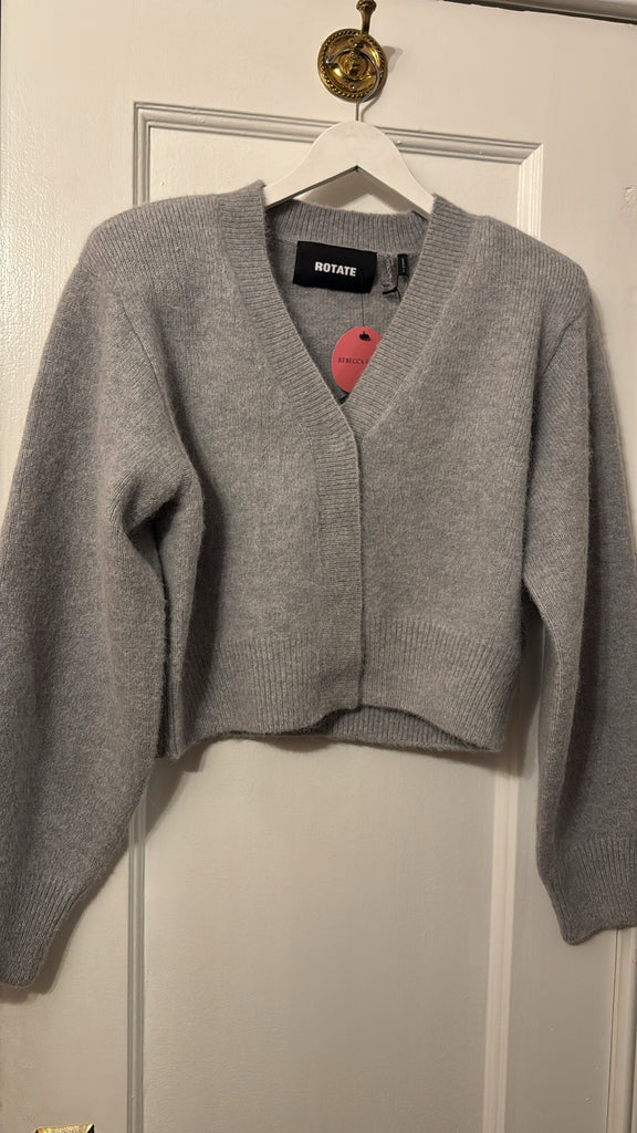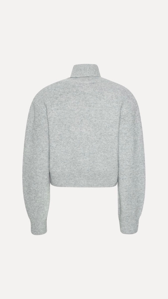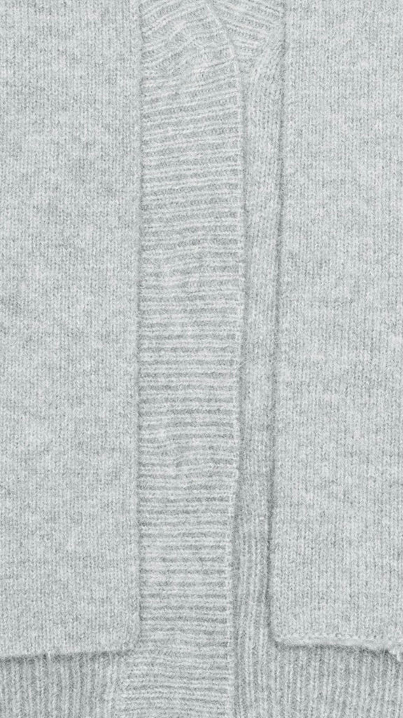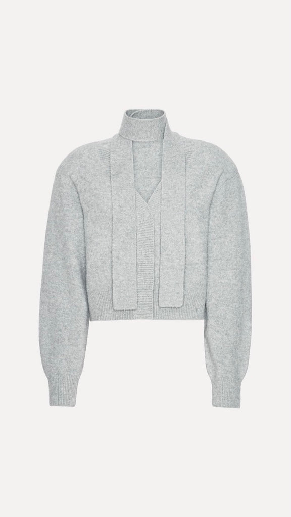 Knit Scarf Cardigan Light Grey is a slightly cropped knit cardigan with a deep V-neck, wide shoulders, and a matching removable scarf. Crafted from a soft wool and alpaca blend with ribbed hem and cuffs.