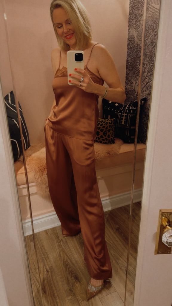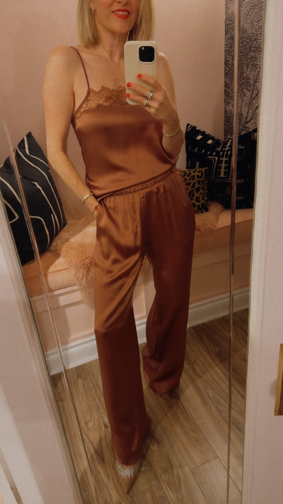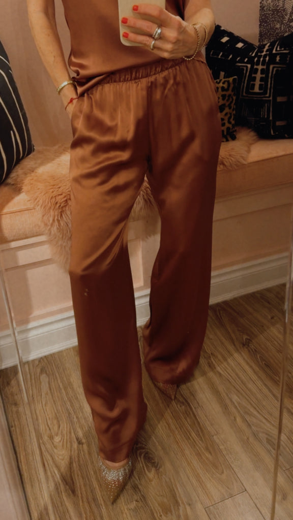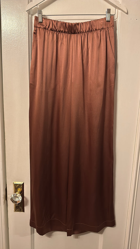 Pull-on wide-leg silk pant with a flat front and elastic waistband.