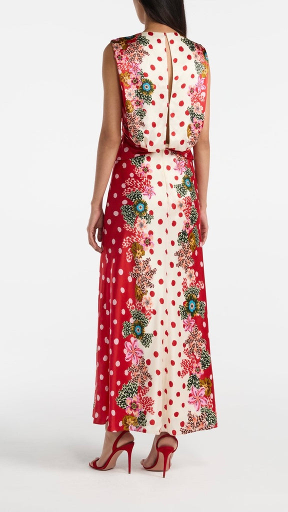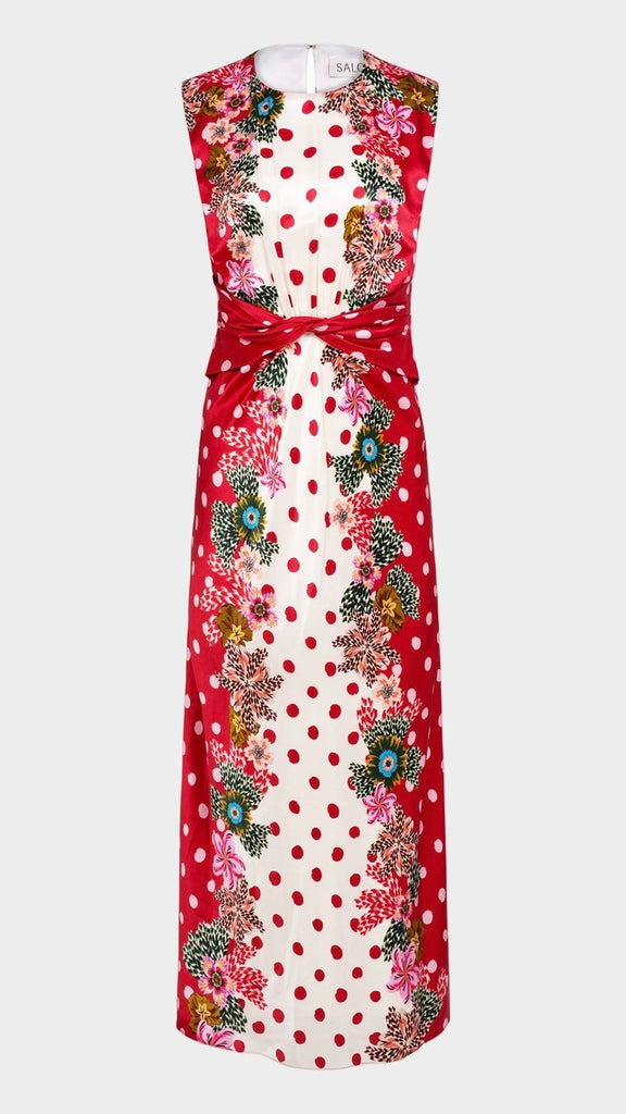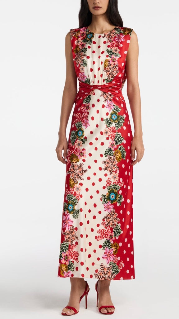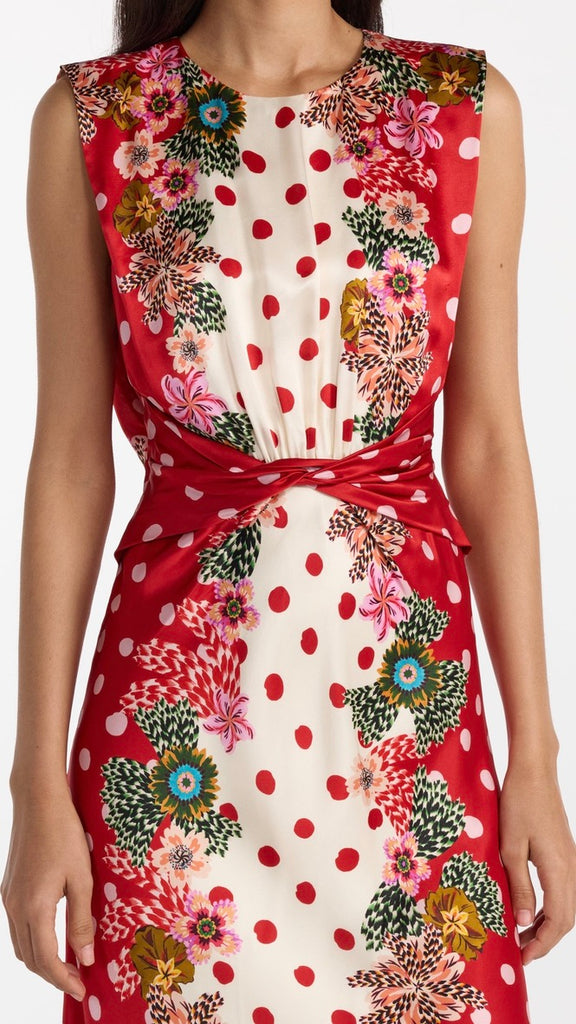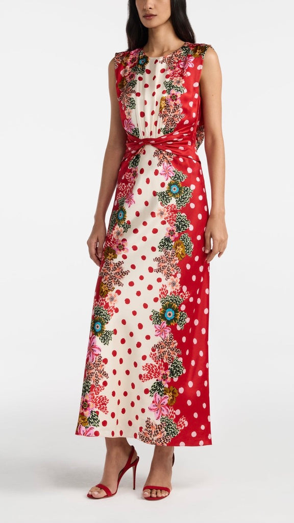 The Gwen Dress is a study in effortless elegance. Its sleeveless design features a beautiful twisted detail on the bodice and soft gathers at the waist, creating a flattering silhouette. The print features luscious plumeria borders that contrast strikingly with the fresh and classic polka dot base. Perfect for parties and weddings, this timeless, refined dress is ideal for celebrating life’s most memorable moments.
