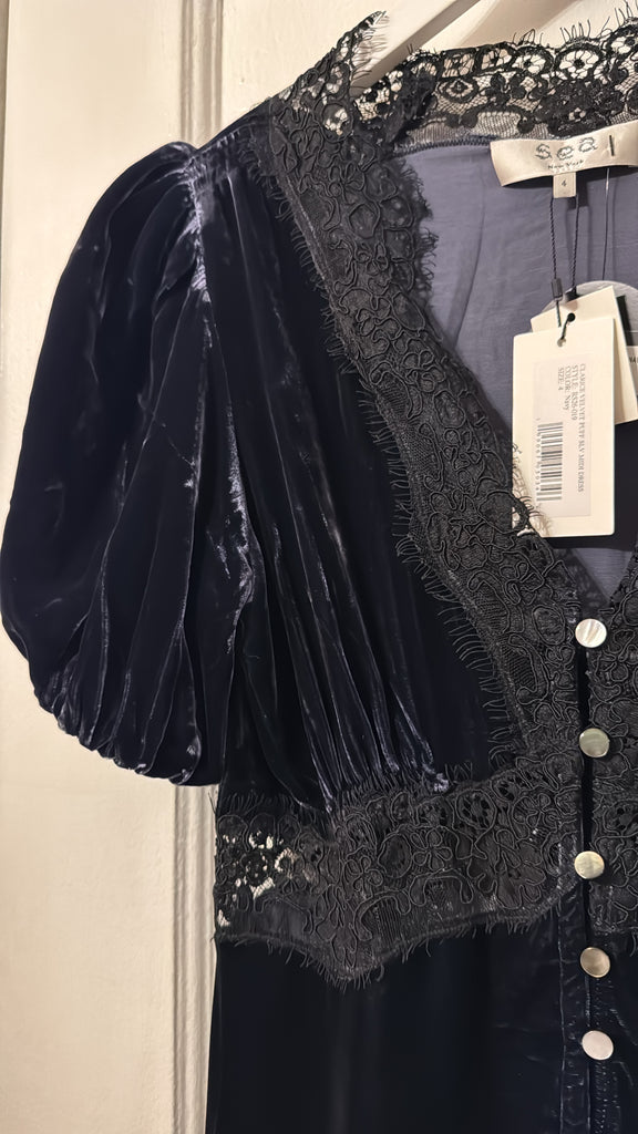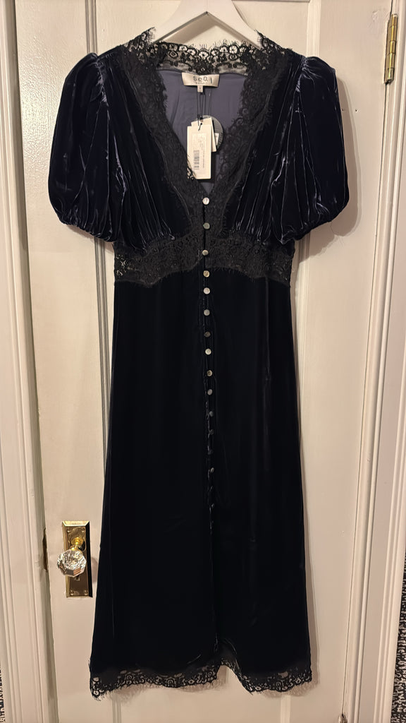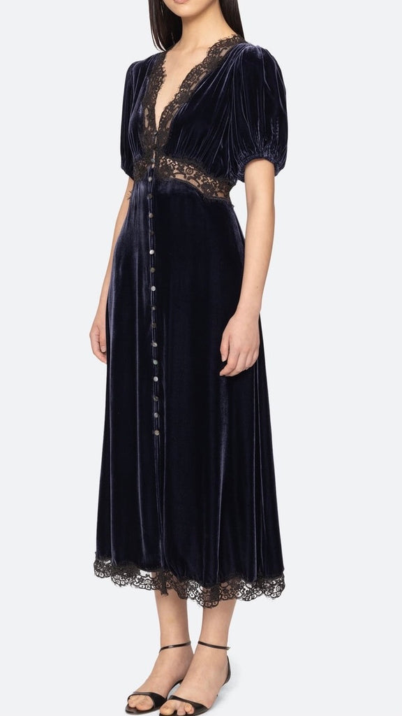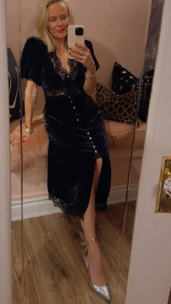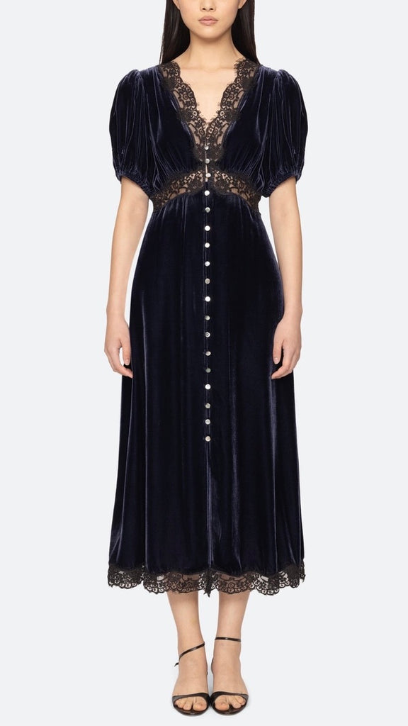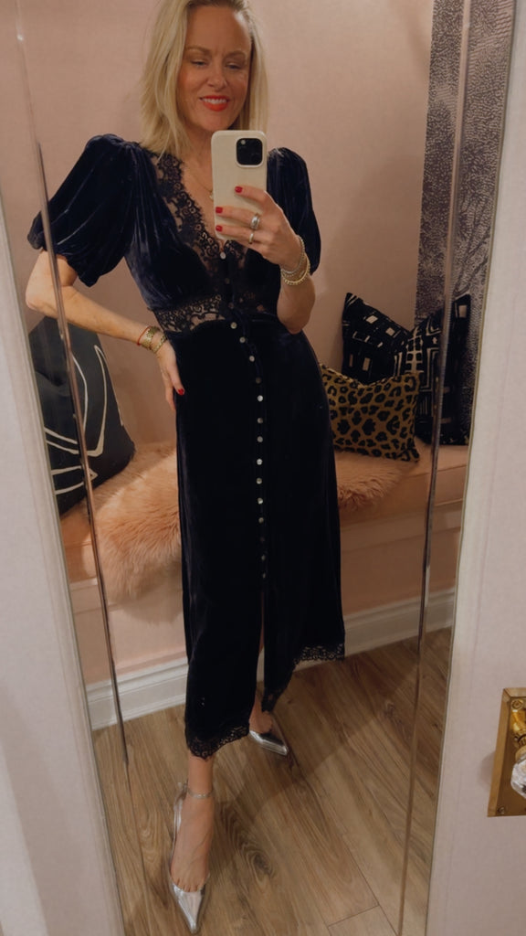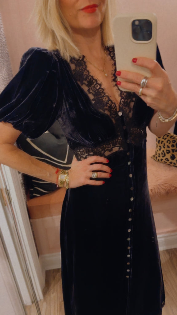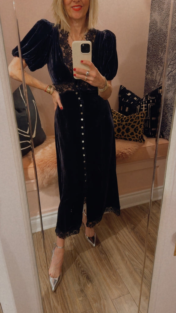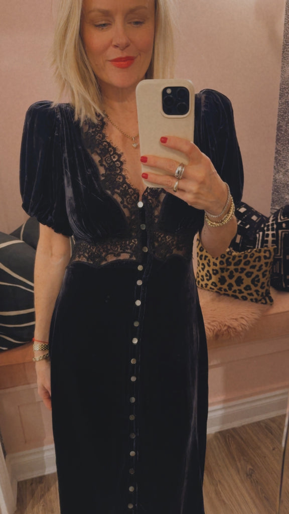 The Clarice velvet dress features a deep v-neckline and a delicate button-down front, framed by short puff sleeves. Intricate lace trim lends a romantic contrast to the plush velvet, while the midi silhouette offers an effortlessly refined shape. A timeless piece that balances vintage charm with modern elegance.