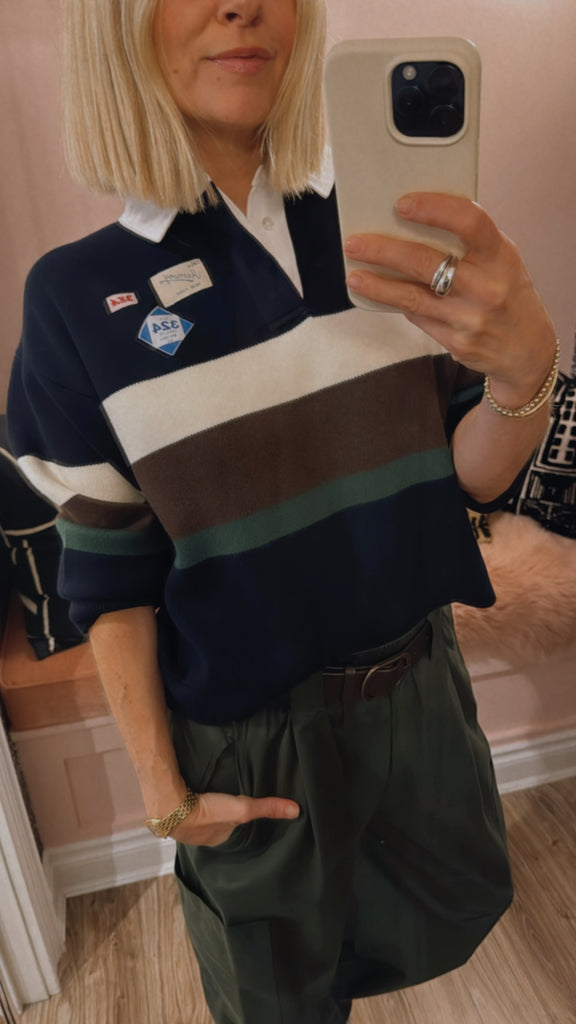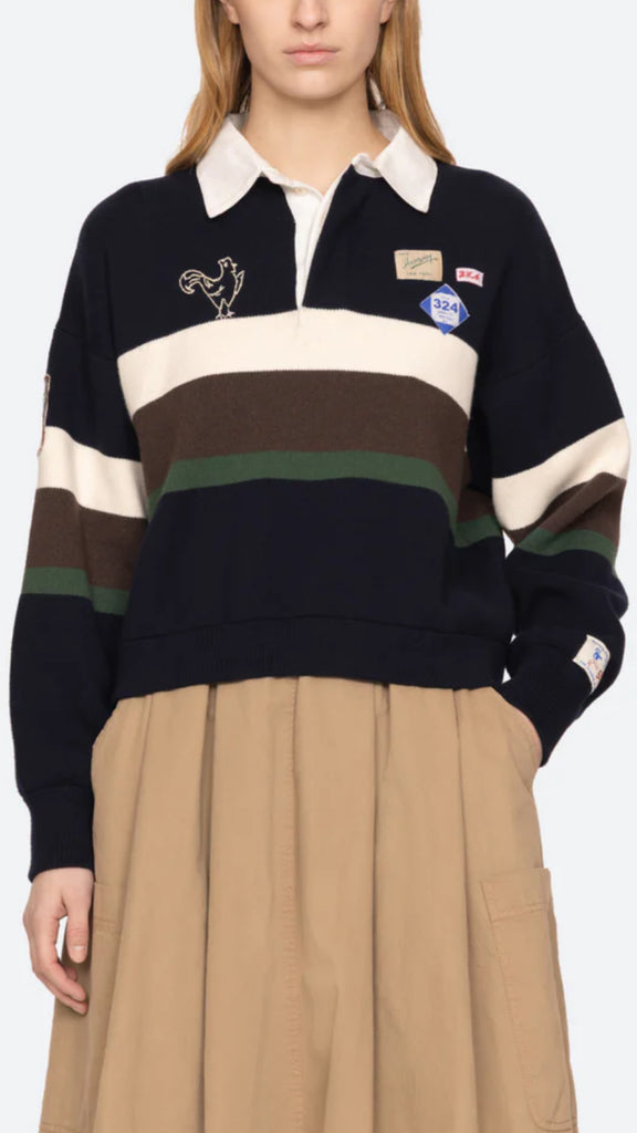 Inspired by vintage rugby styles, the Arther rugby sweater stands out with graphic color blocking, embroidered detailing, and custom 'Sea' labels. A fresh take on a collegiate classic.