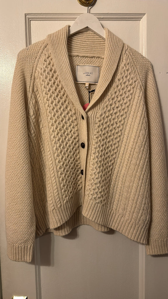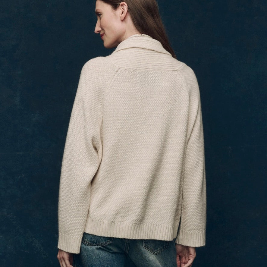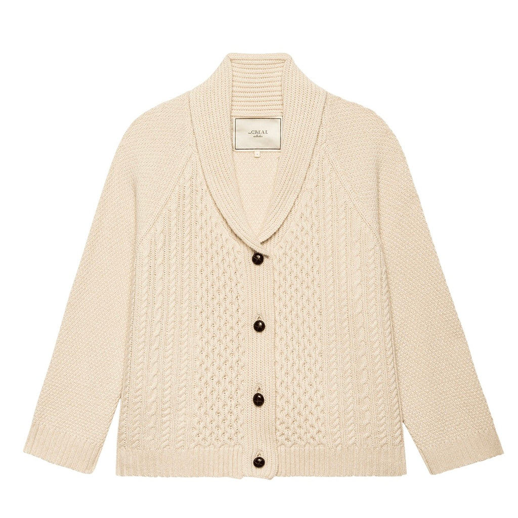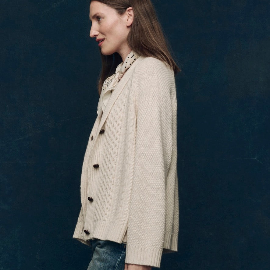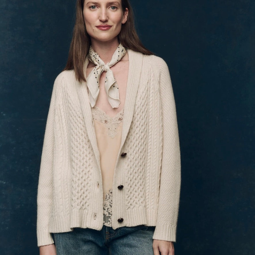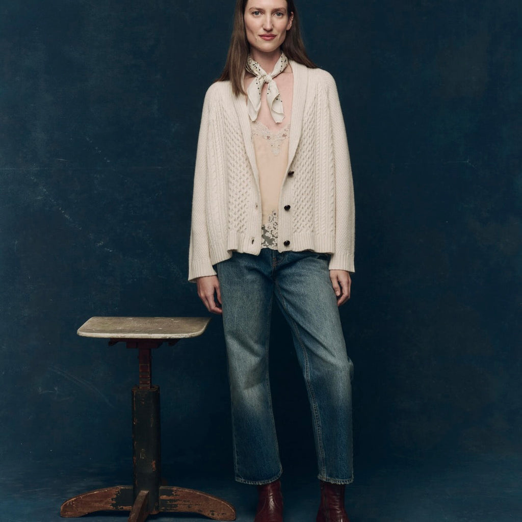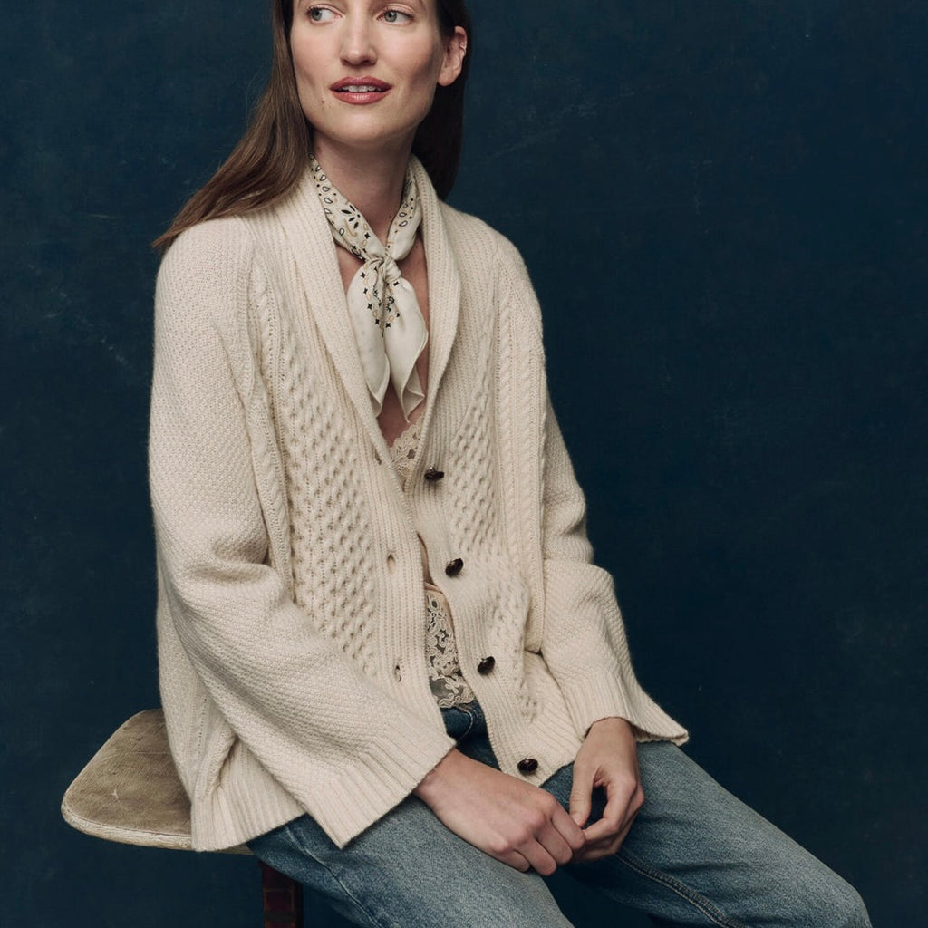 Spun from 100% cashmere in a traditional cable stitch, The Cashmere Cable Lodge Cardigan is a warm and textural layer with a relaxed shape. It features raglan sleeves, a shawl collar, and real leather buttons. Soft yet substantial, this version is slightly slouchier than the original Lodge silhouette—easy to pack, easy to wear, day after day.