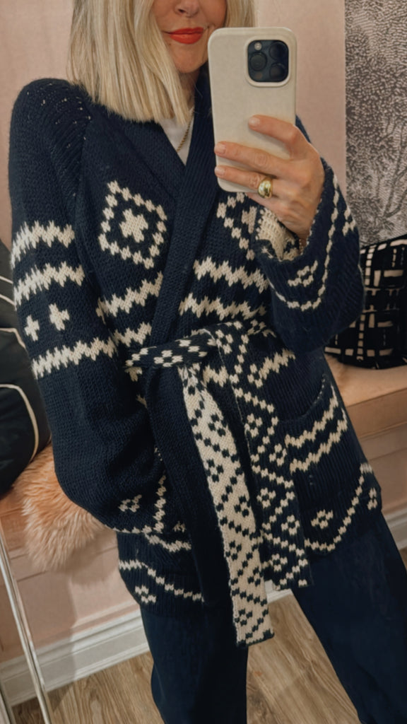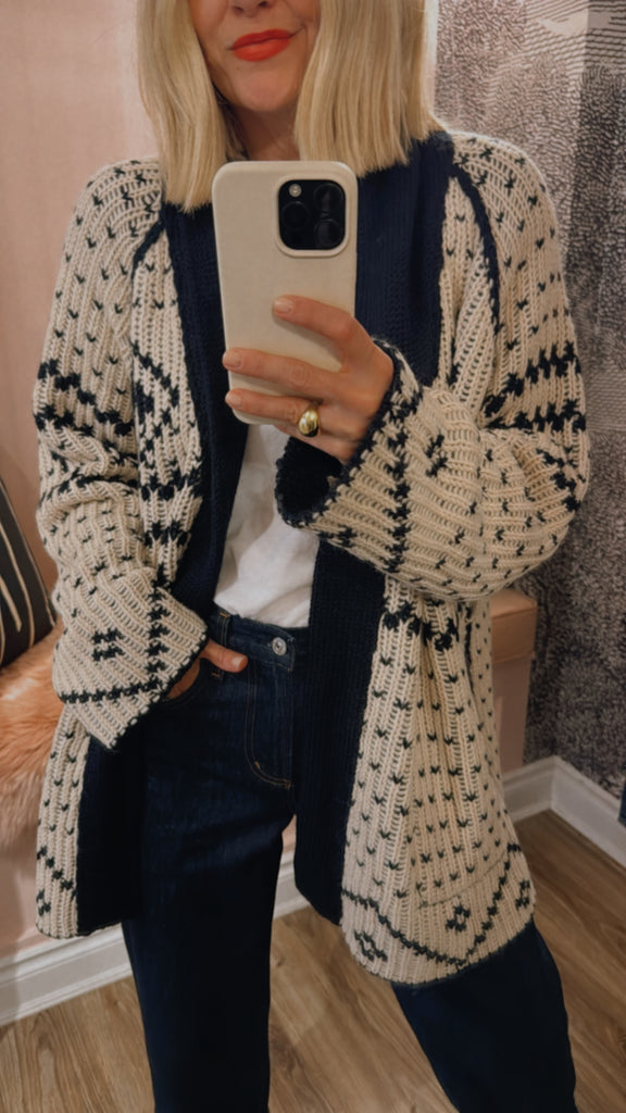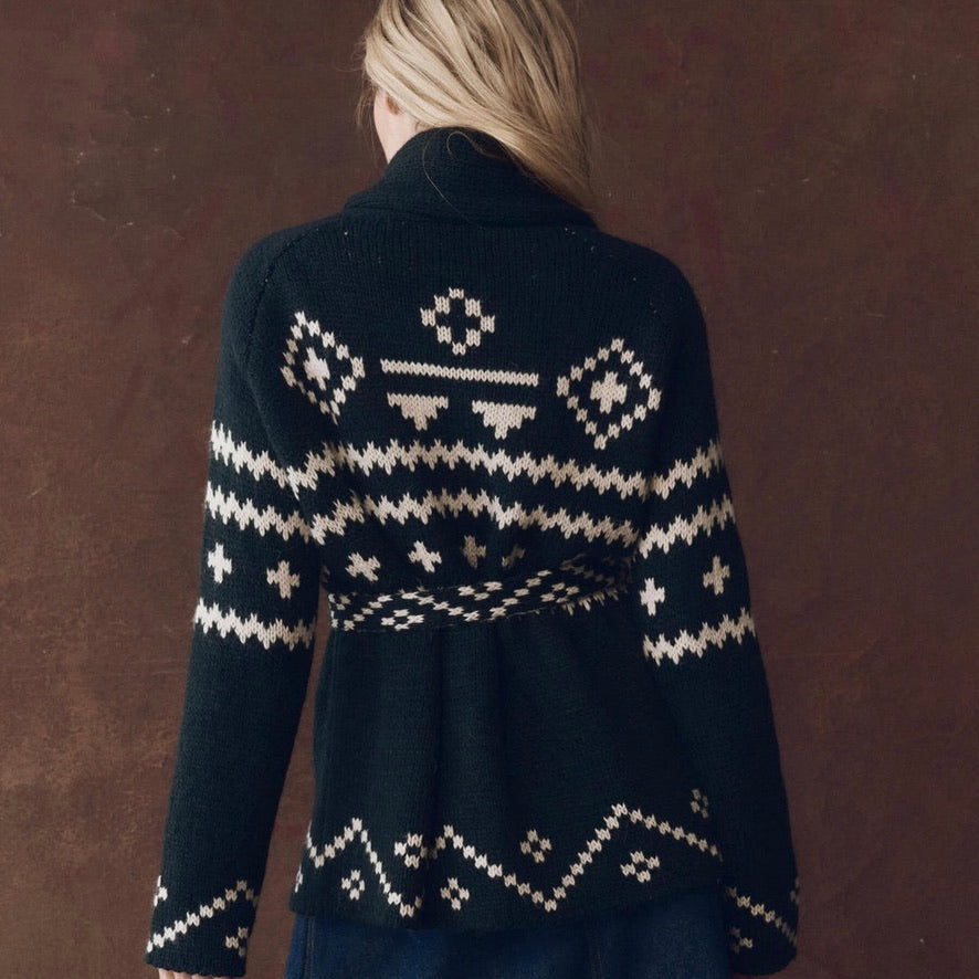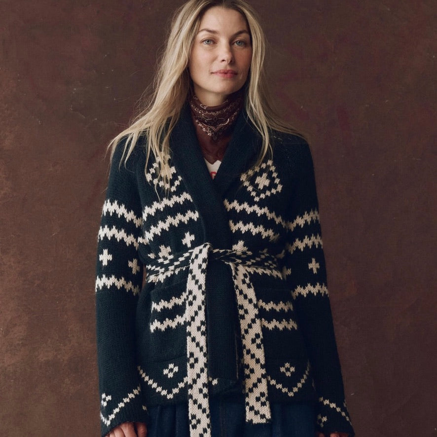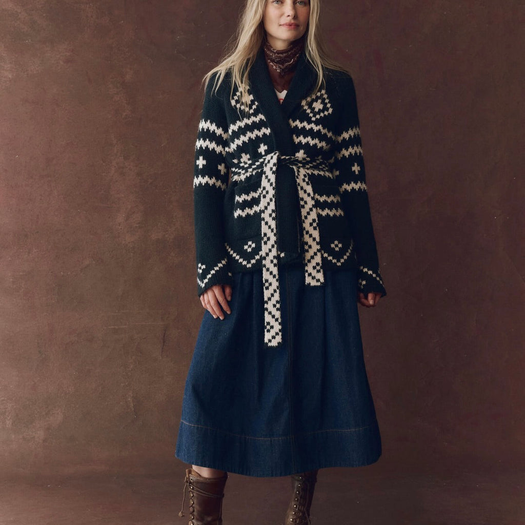 The Reversible Shepherd Cardigan is a longer-length shawl style spun from alpaca in a double jacquard technique for full reversibility. With raglan sleeves, no front closure, and a removable waist tie, it’s easy to wear two ways—on the cream side or navy side.