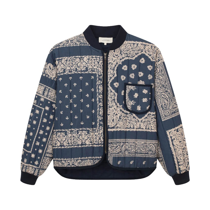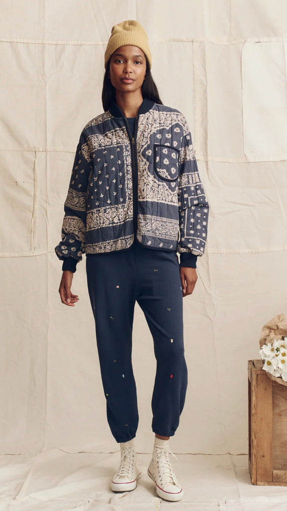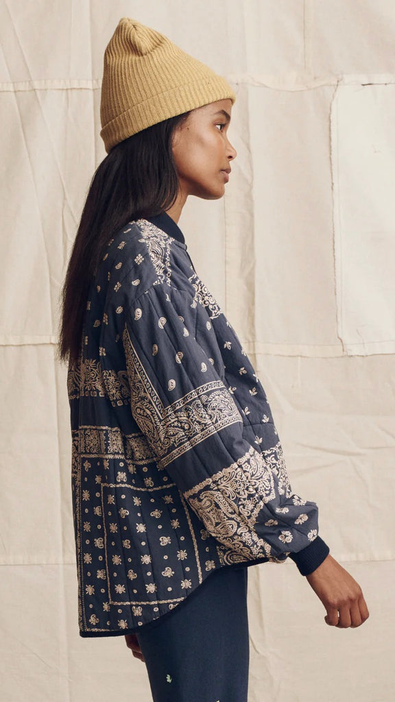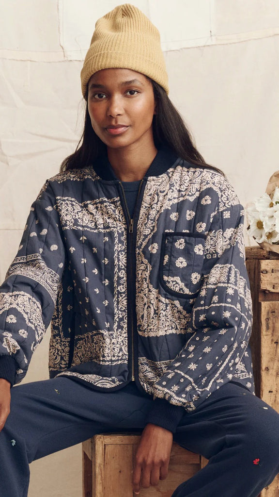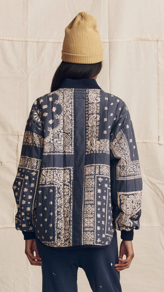 The Quilted Bomber revisits a classic bomber silhouette, cut in the season’s Bandana Print—a longstanding motif within the collection. The style features hand pockets, rib-knit cuffs, a high–low curved hem, and a metal zip closure.Cut with a generous proportion for ease and layering, the quilted construction offers lightweight warmth.