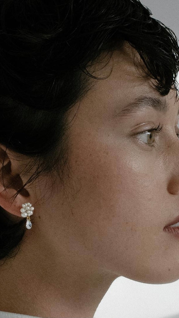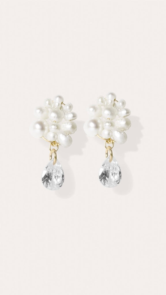 A group of freshwater pearls connects to a pear shaped cubic zirconia. Secured with an earring post and clip fastening.