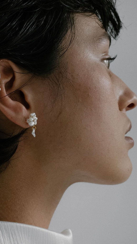 The piece is thoughtfully handcrafted using recycled sterling silver plated in 14ct yellow gold vermeil, with freshwater pearl and cubic zirconia.