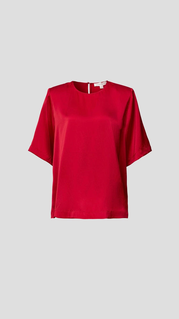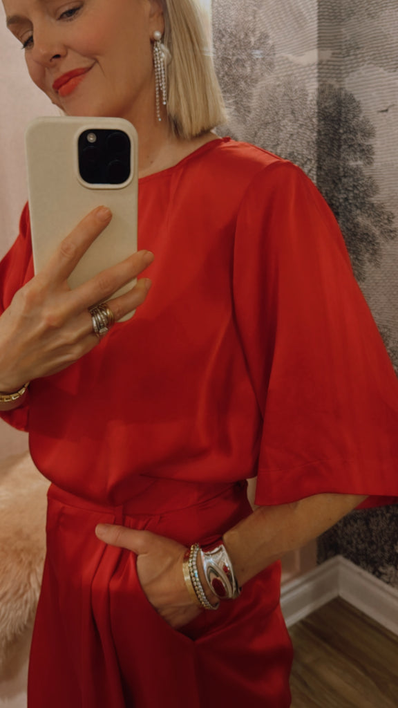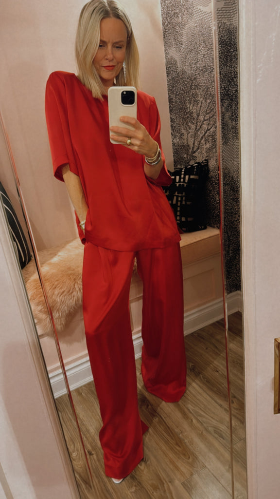The Elysian Tee, an elevated relaxed silhouette, crafted in our signature cupro blend in a fiery sunset red. Featuring a dropped shoulder, wide sleeve, and hi-low hem with a soft curve and side splits, it offers subtle structure with removable shoulder pads. Pair with the Whirlwind Pant for a coordinated set that exudes modern simplicity.