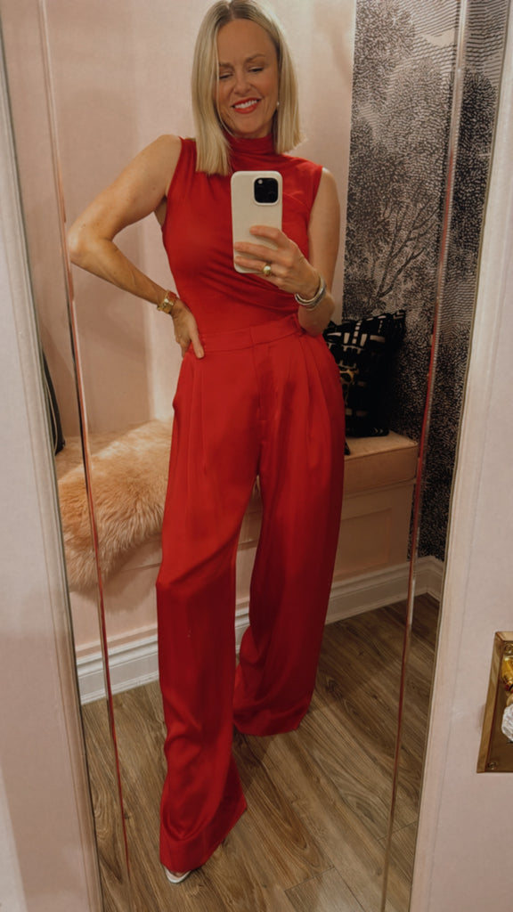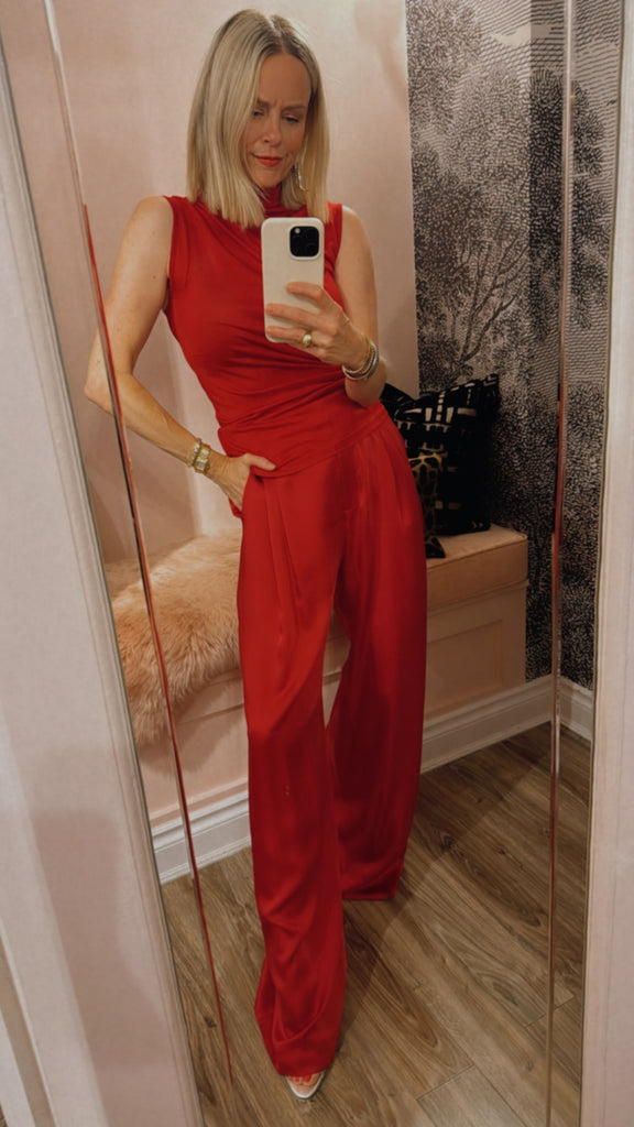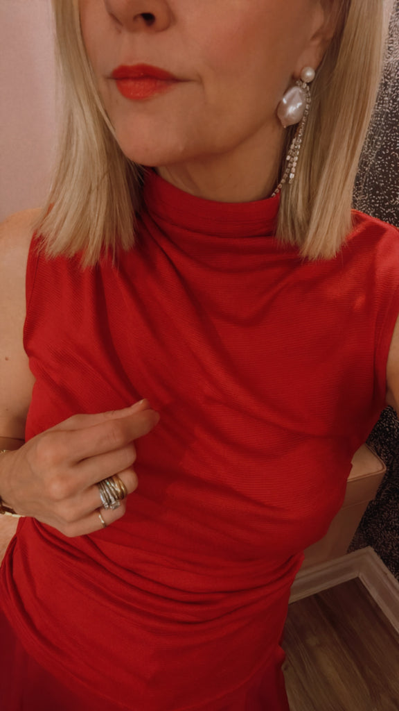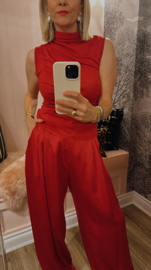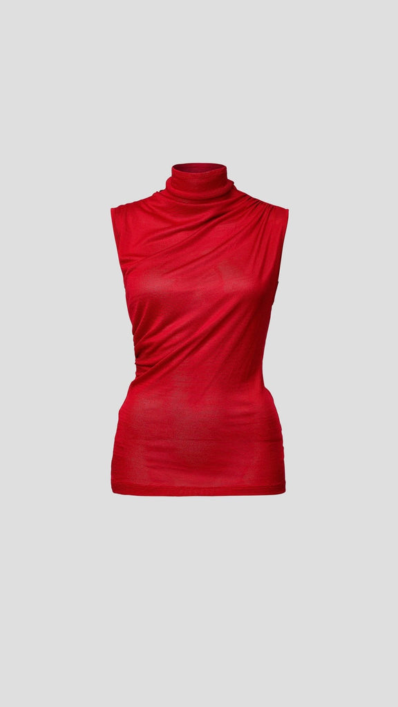 The Sunset Top, a sleeveless take on our best selling Moonlight Skivvy, is crafted in a fiery sunset red. Featuring an exaggerated turtleneck and subtle ruching, its slightly sheer fabric adds an ethereal touch. Wear layered or as a standalone statement, pairing it with the Whirlwind Pant for a set dressing moment, or style back with denim or black.