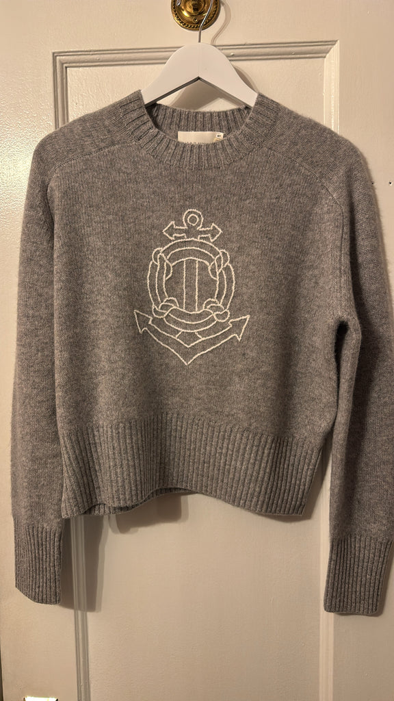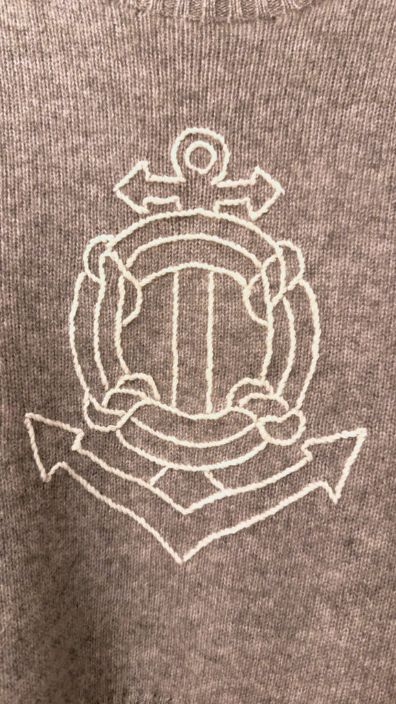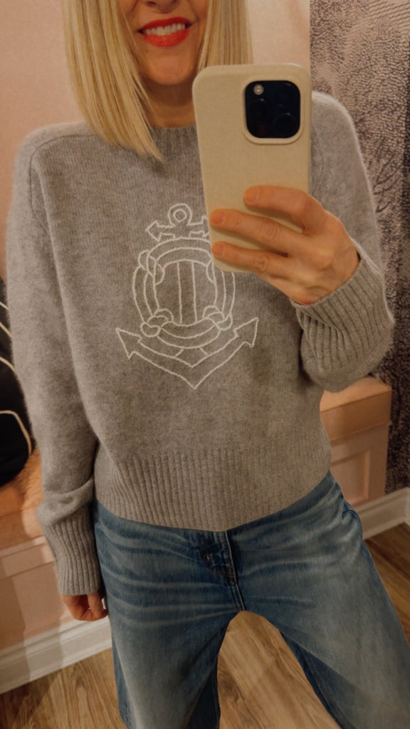 Beautiful and soft, this 100% Cashmere crewneck sweater is slightly boxy, with a raglan sleeve and an anchor embroidered on the front.