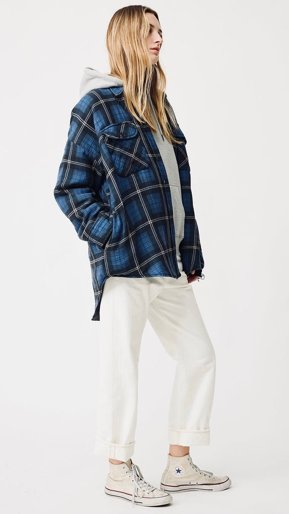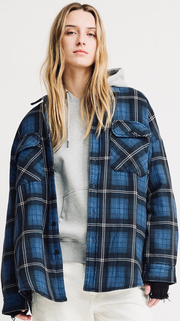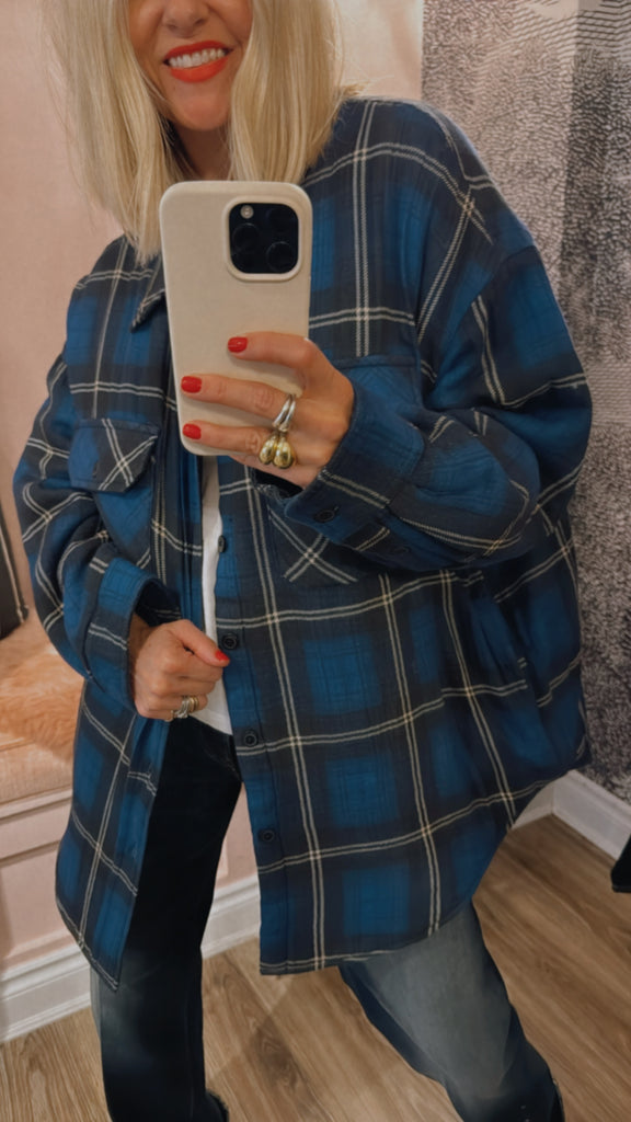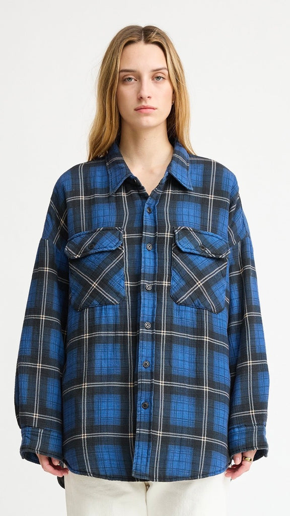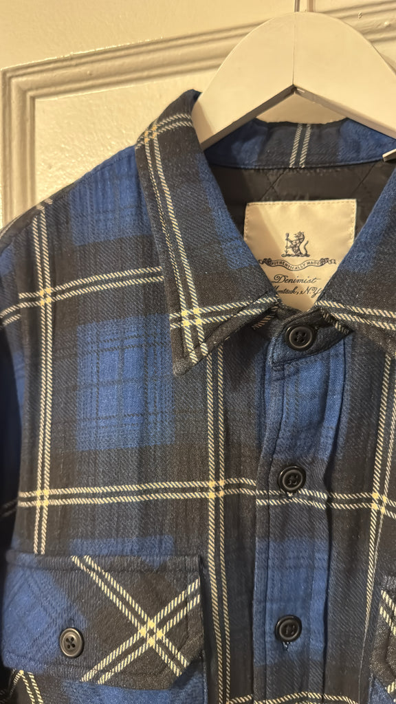 The CPO Shirt Jacket in printed blue and black plaid is crafted from soft cotton with a structured shape. Features buttoned chest pockets, a boxy silhouette, and clean finishes throughout.