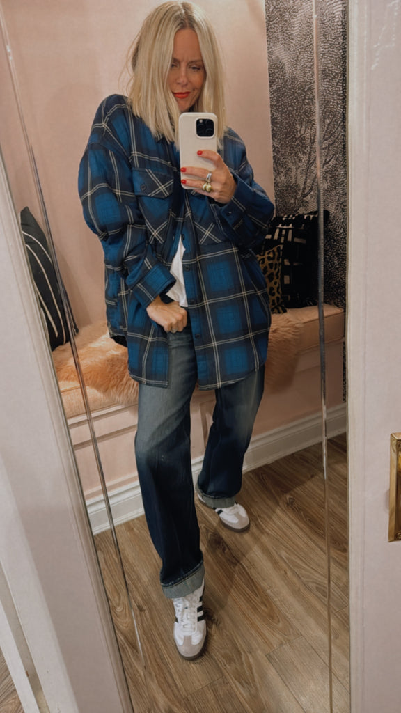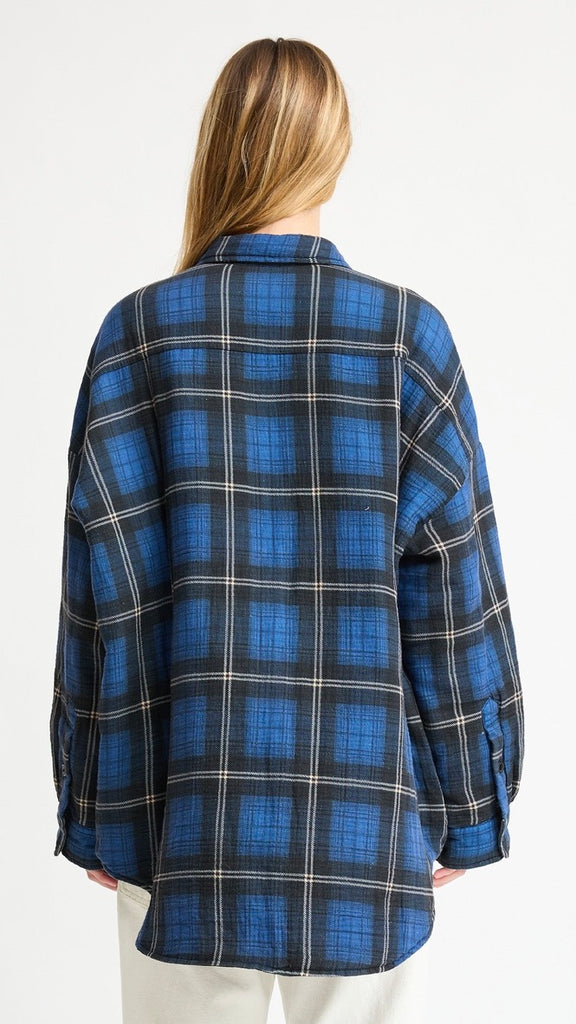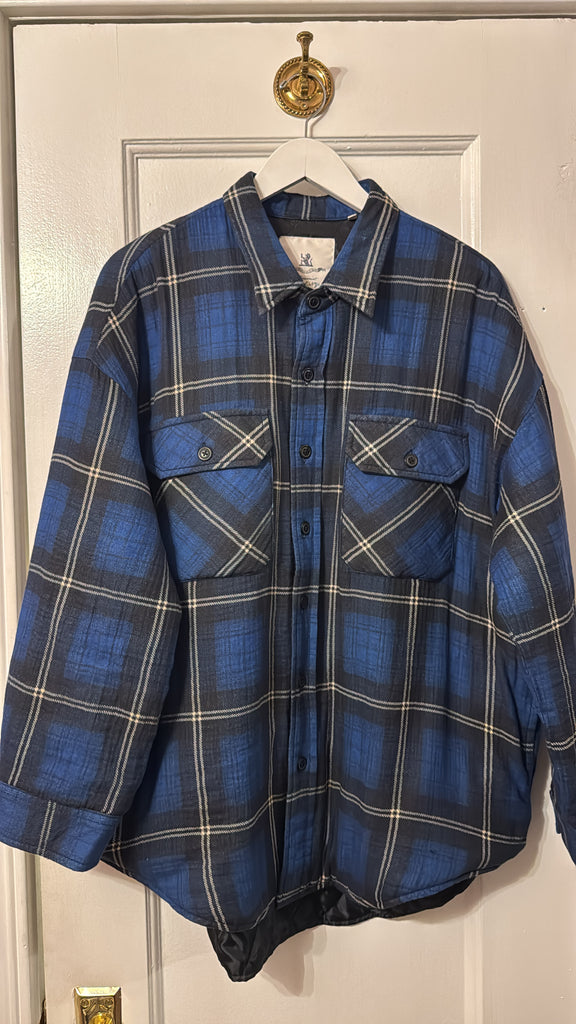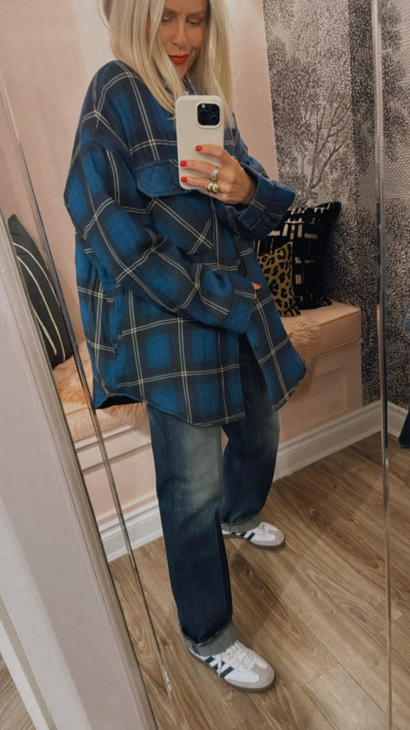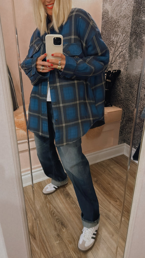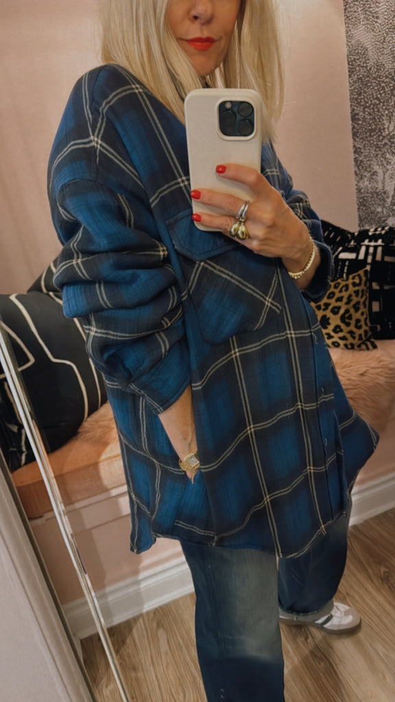 The CPO Shirt Jacket in printed blue and black plaid is crafted from soft cotton with a structured shape. Features buttoned chest pockets, a boxy silhouette, and clean finishes throughout.
