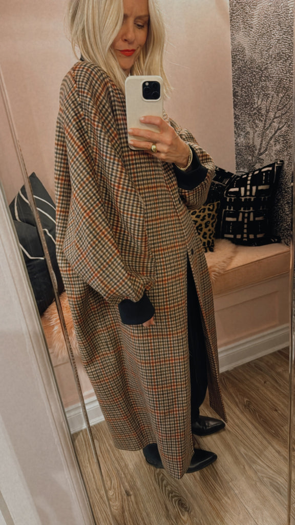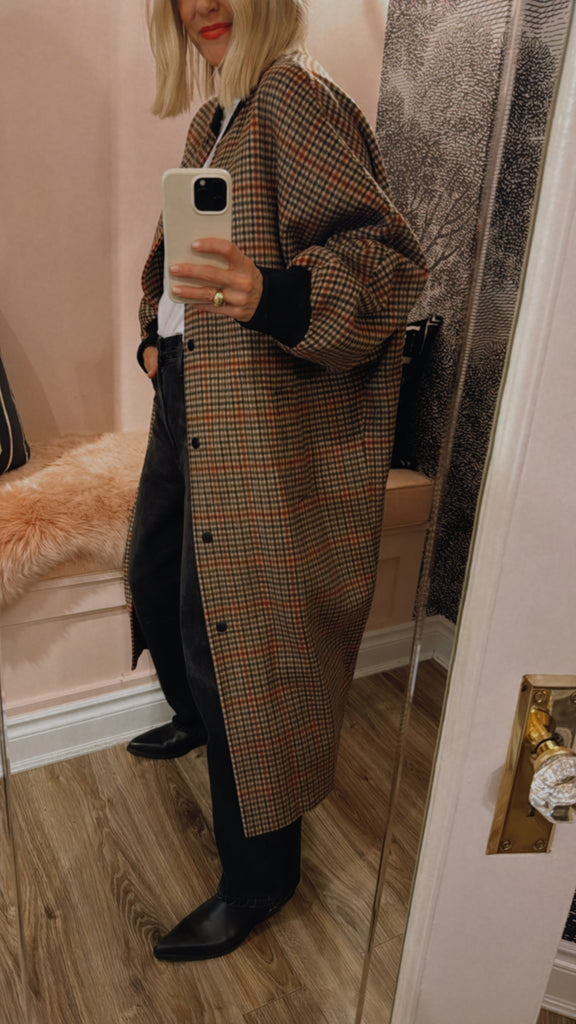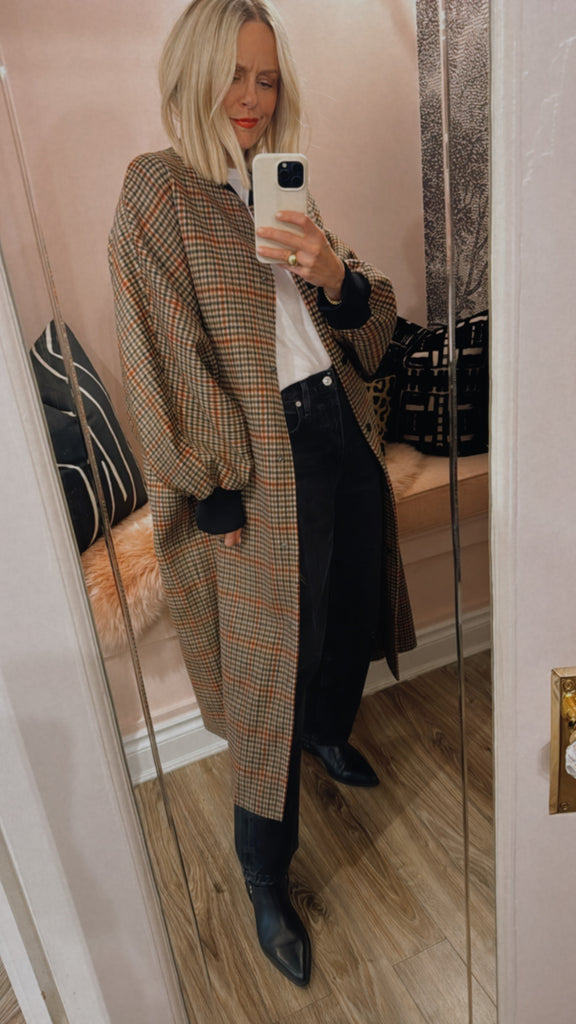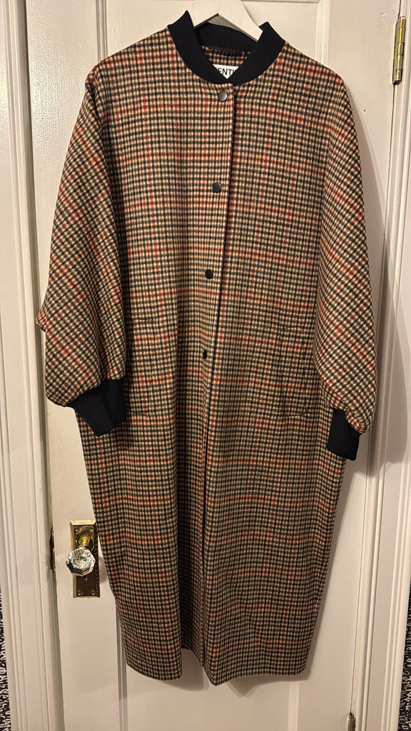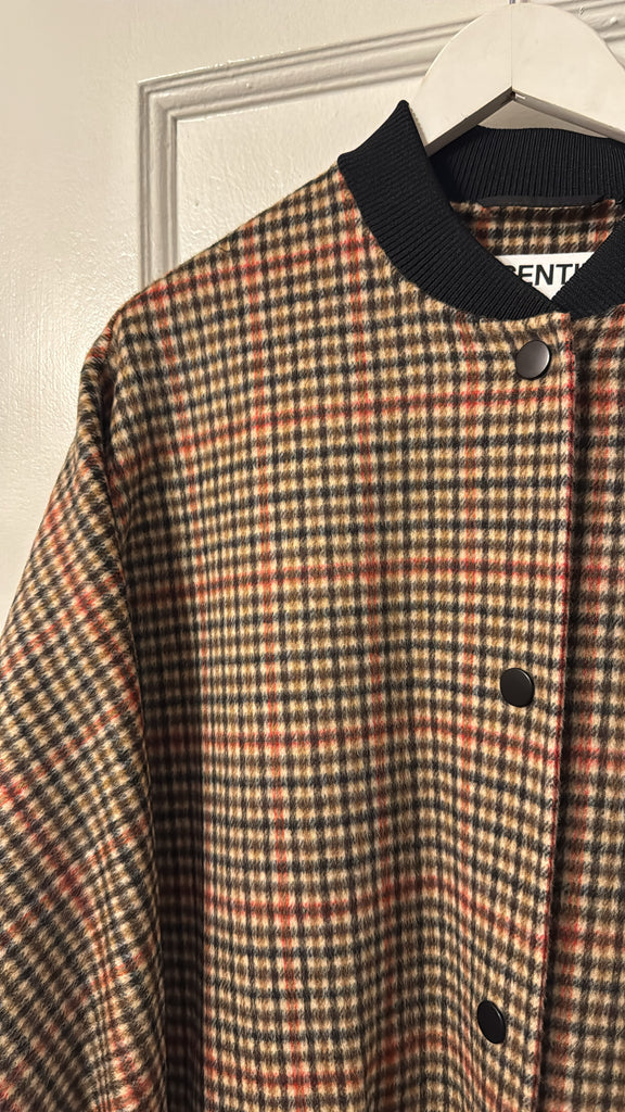 Coat is crafted from 100% wool and features a check pattern. Designed for an oversized fit, it has slanted pockets and a press button fastening. The ribbed collar and cuffs in contrasting color add a sporty bomber style to its timeless design.
