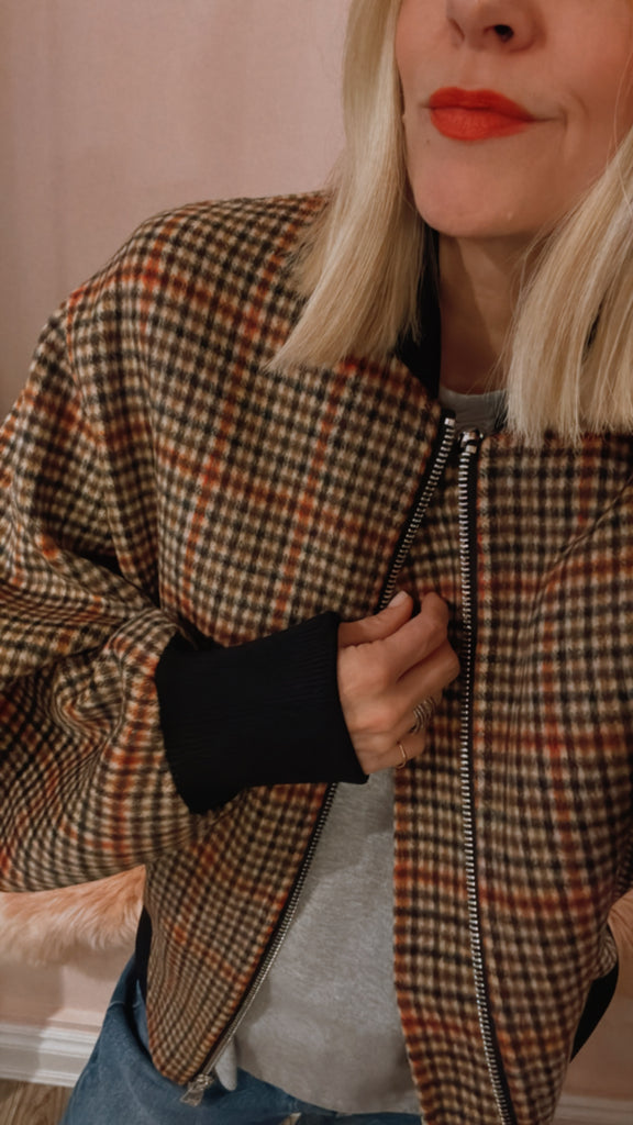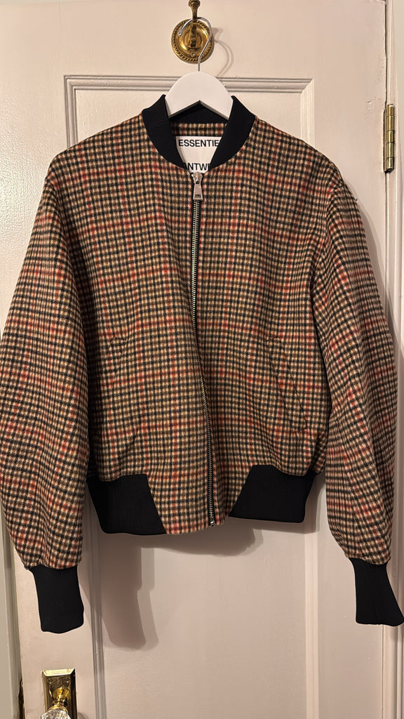 This bomber is crafted from 100% wool and is designed for an oversized fit. It features a full zip fastening, dropped shoulders, and slanted side pockets. This wool fabric showcases a bold check pattern, adding texture and visual interest to this contemporary outerwear piece.