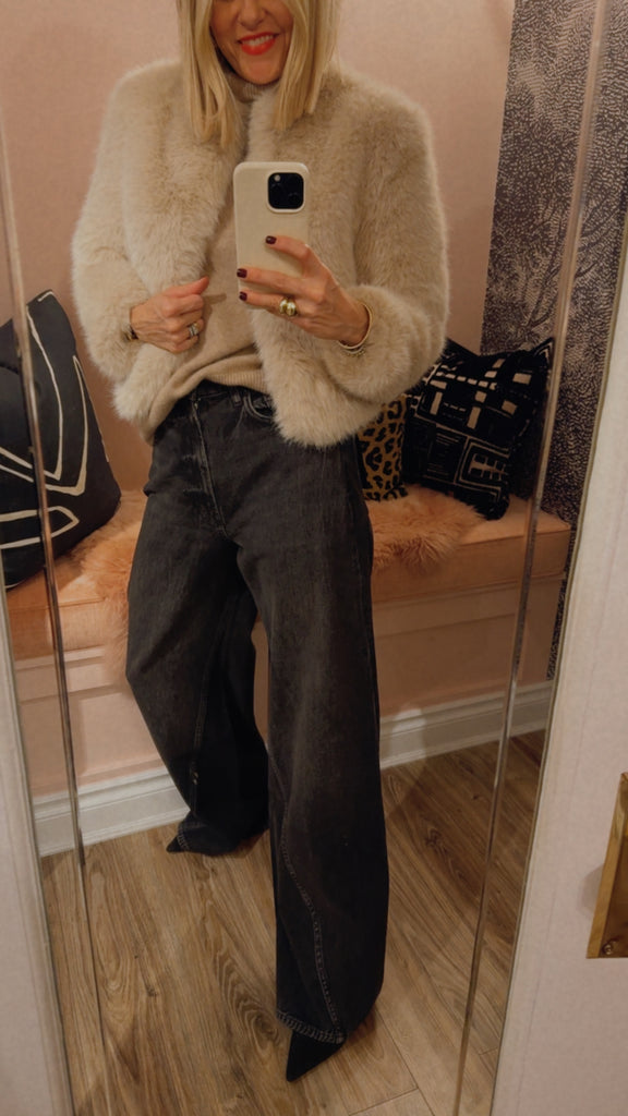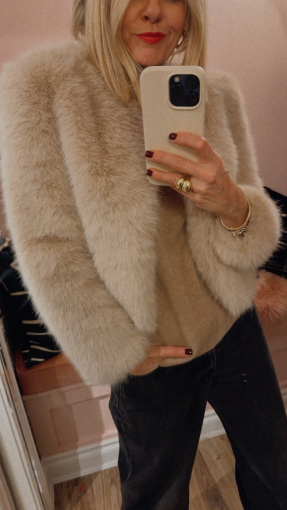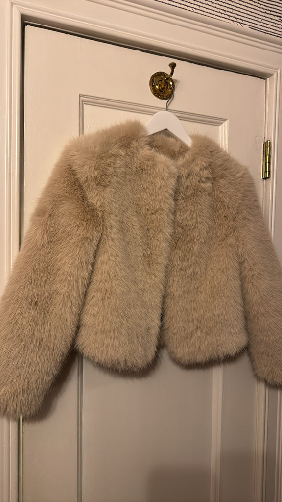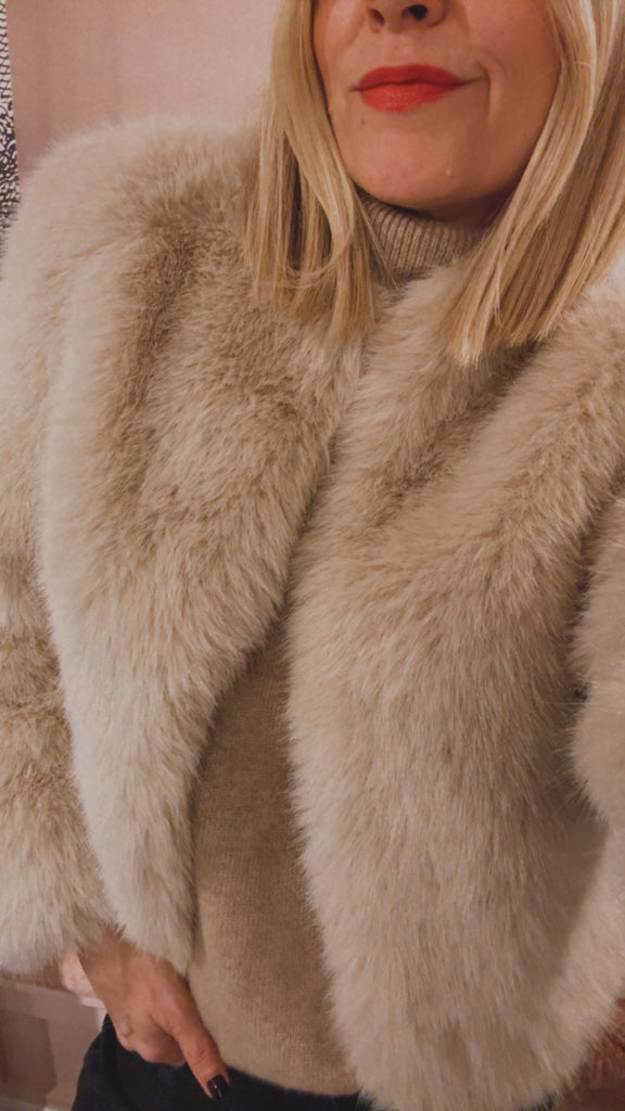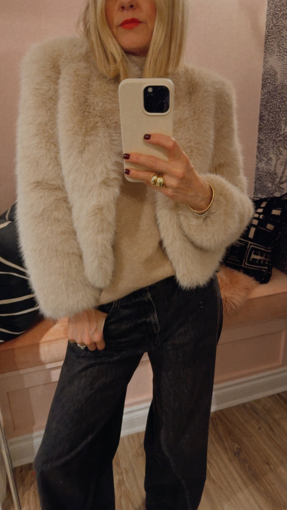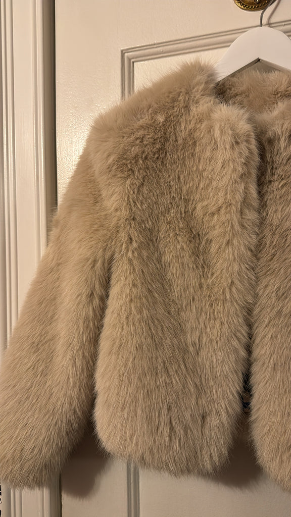 Against the grain. A cropped jacket with a crewneck and boxy fit. Designed in soft faux-fur, Counter Culture is a creamy light pink.