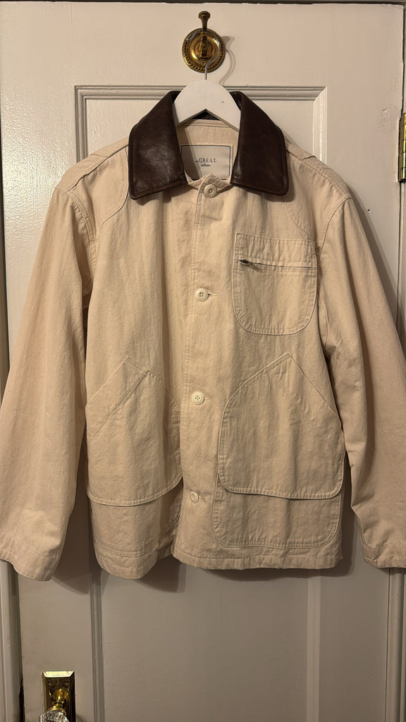 Our take on a heritage New England-style workwear jacket, designed with a relaxed fit. It features utility pockets, pleated vents at the back, and is made from garment-dyed cotton canvas. The contrast collar is crafted from genuine leather, and the jacket is finished with corozo buttons at the front placket and cuffs.