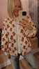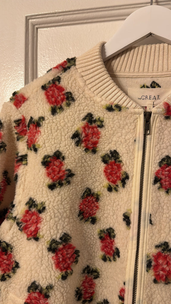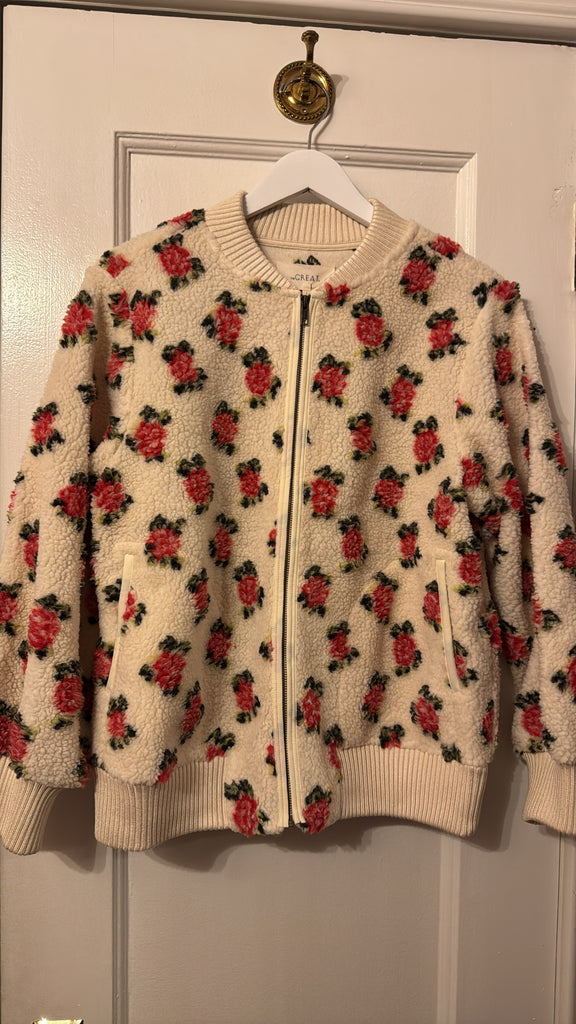 This faux sherpa bomber jacket is adorned with a rose pattern and features ribbing at the cuffs, collar and waistband, and pockets.