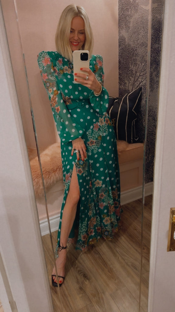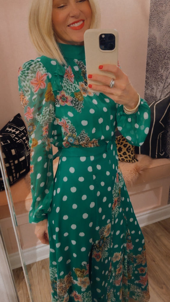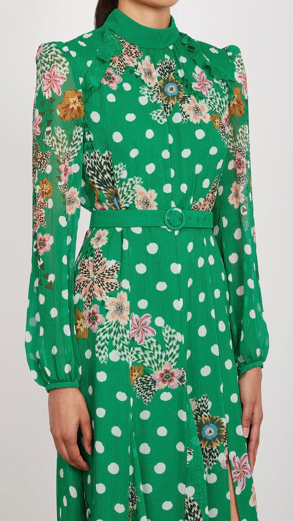 The Jacqui-B dress features a high neck, ruffles and a high slit on the full skirt to add movement and elegance.