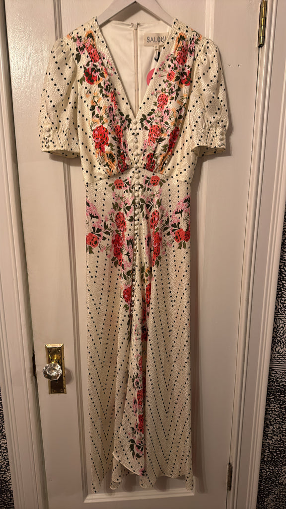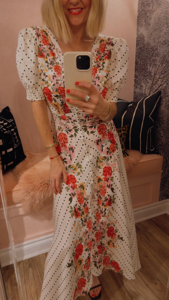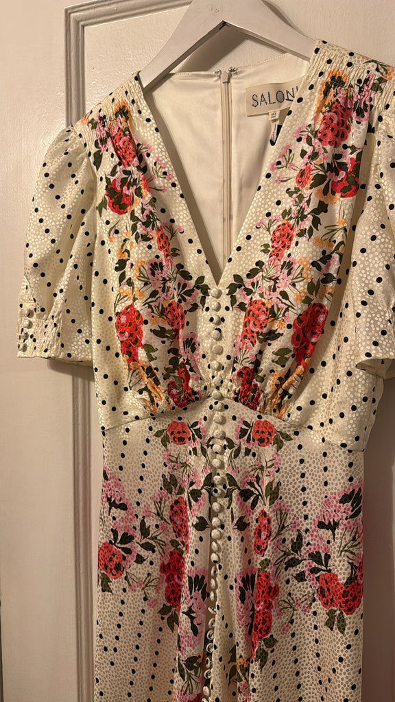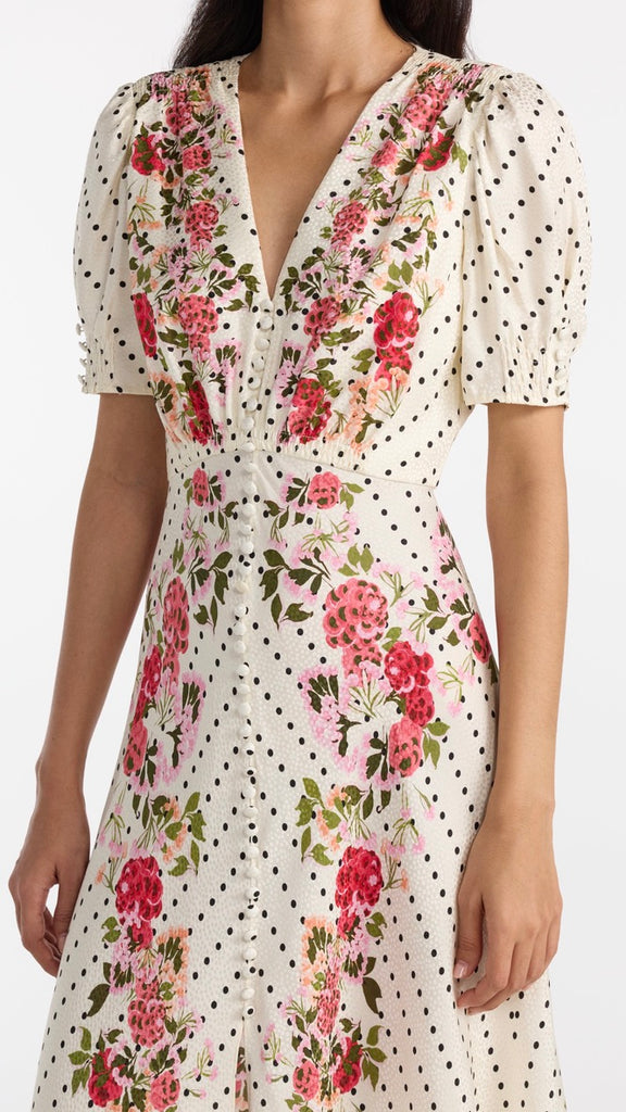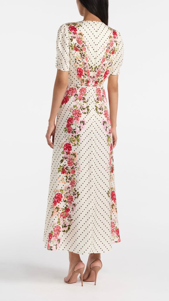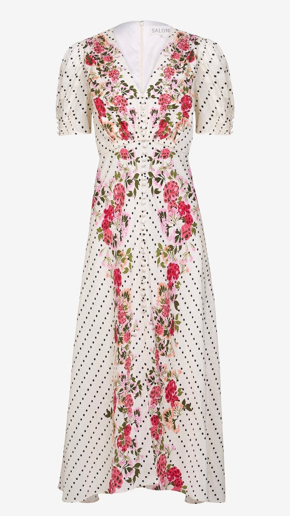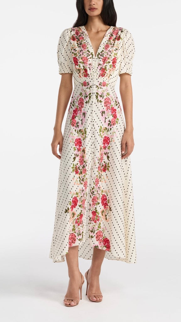Crafted from stamped satin in a meticulously executed bias cut, the Lea Long dress drapes beautifully and flatters the figure. The graceful silhouette is accented by a sophisticated print placement featuring classic polka dots framed by a soft rose-toned floral border. It can be effortlessly styled with heels or flats, the perfect go-to dress for any occasion.