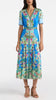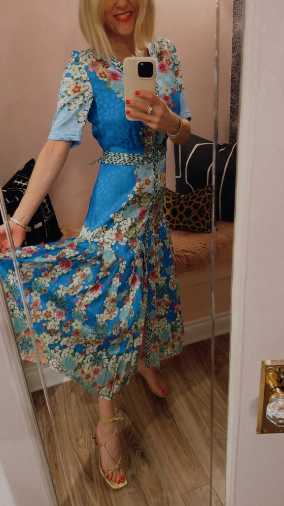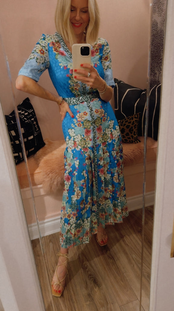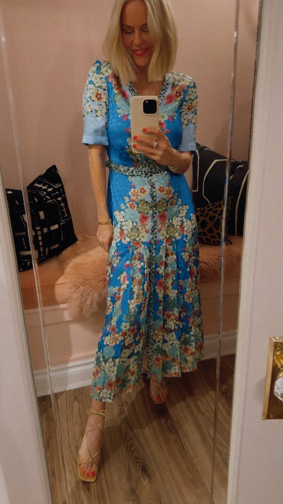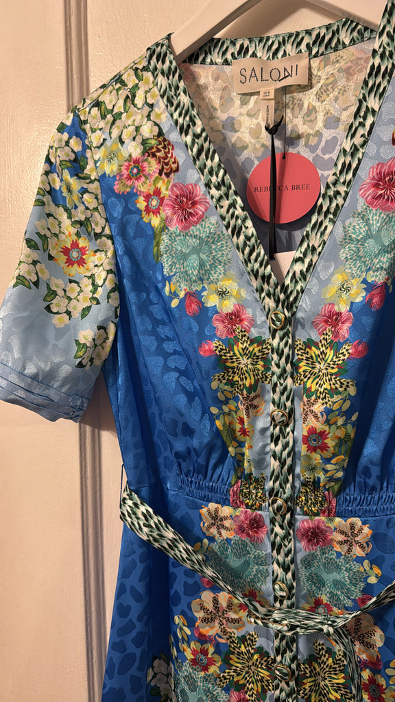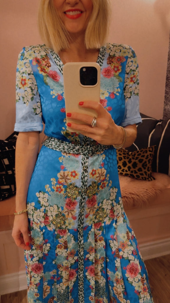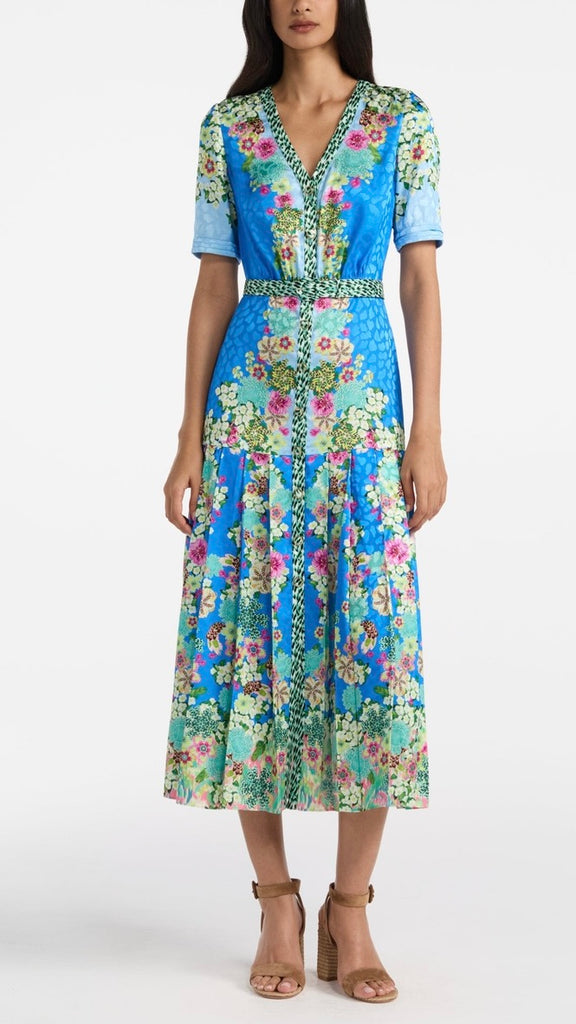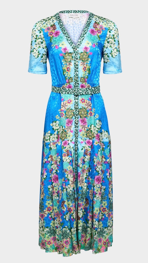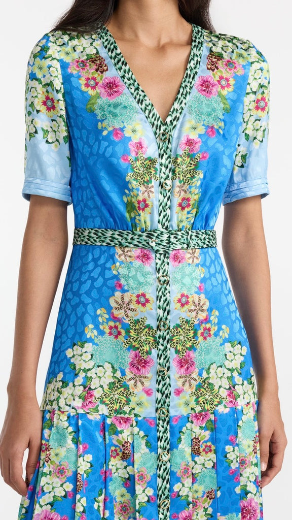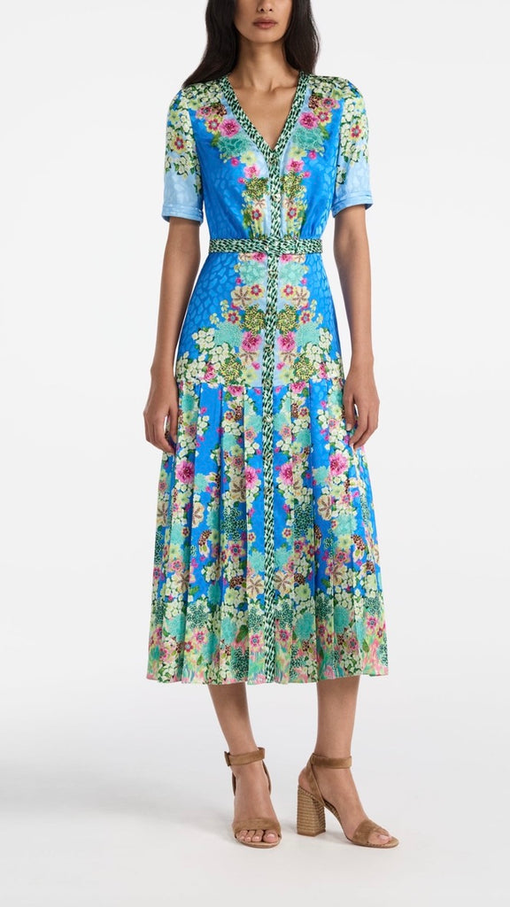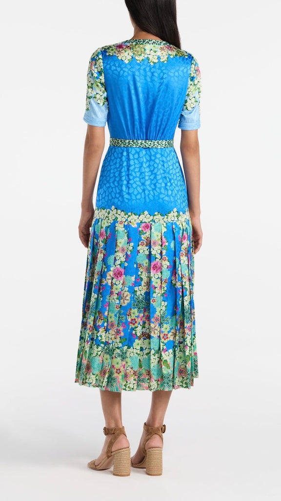 The Lea Shirt-C Dress combines relaxed structure with playful detailing. Crafted from stamped satin, it features a roomy and comfortable fit, balanced by a pleated skirt that moves gracefully with every step. A contrasting placket and belt add modern, graphic accents. Striking tonal borders run sinuously over a light blue background, complemented by exquisite florals and graphic feather accents. A unique statement piece for day and evening events.