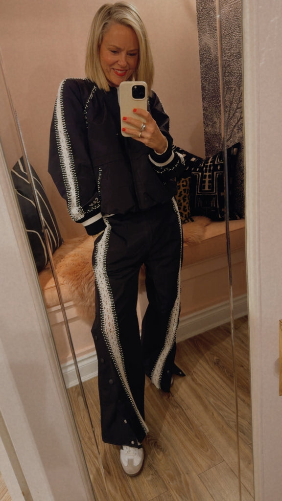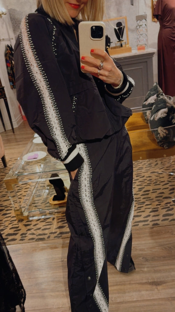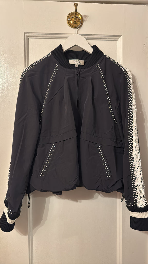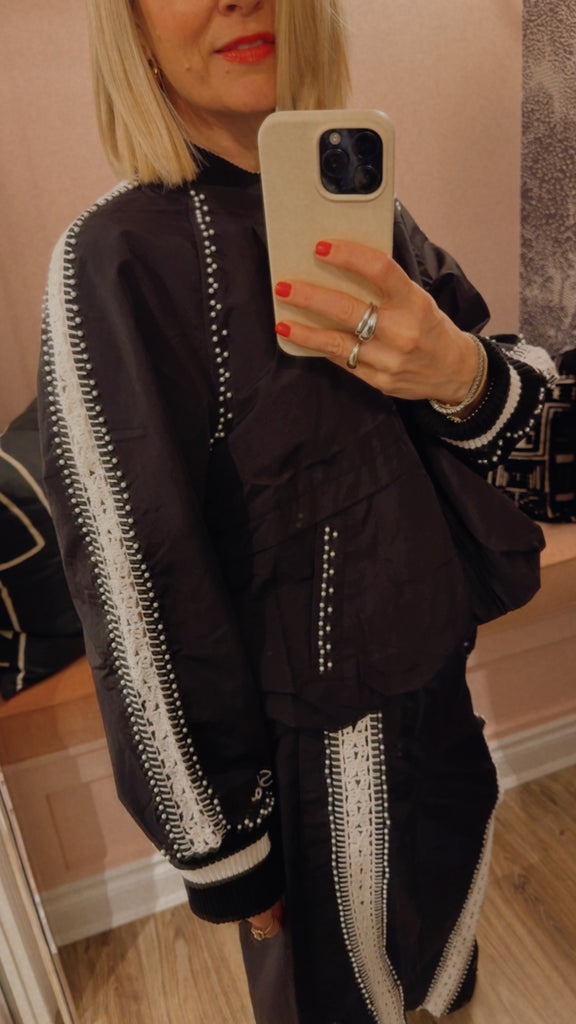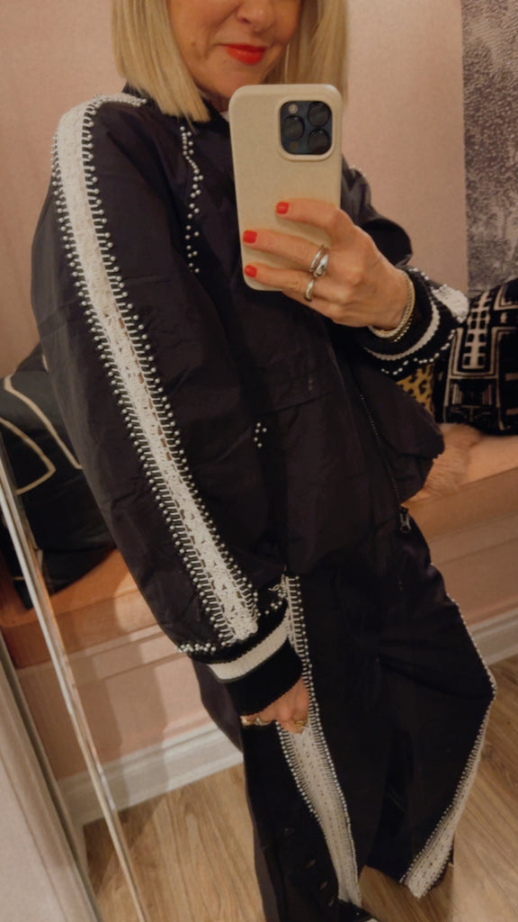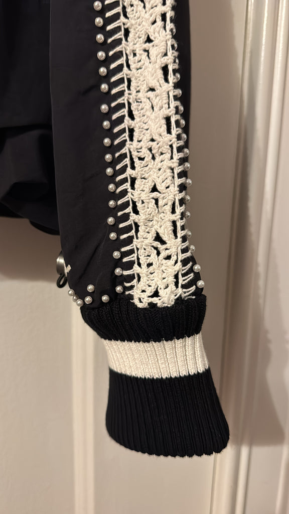 The Alberta windbreaker jacket is thoughtfully detailed with hand-crocheted trim and delicate pearl accents throughout. This unexpected pairing of utility and craft adds a refined, feminine touch to the lightweight silhouette.
