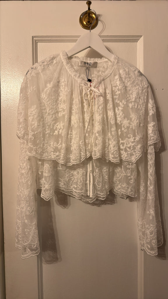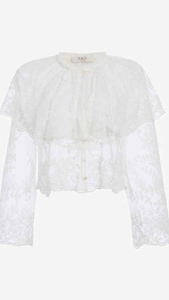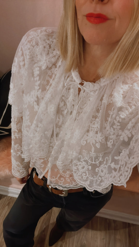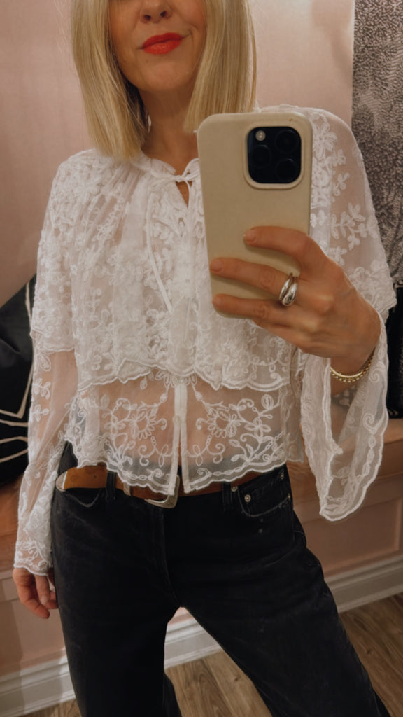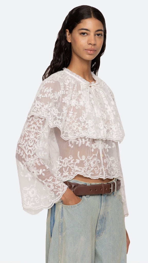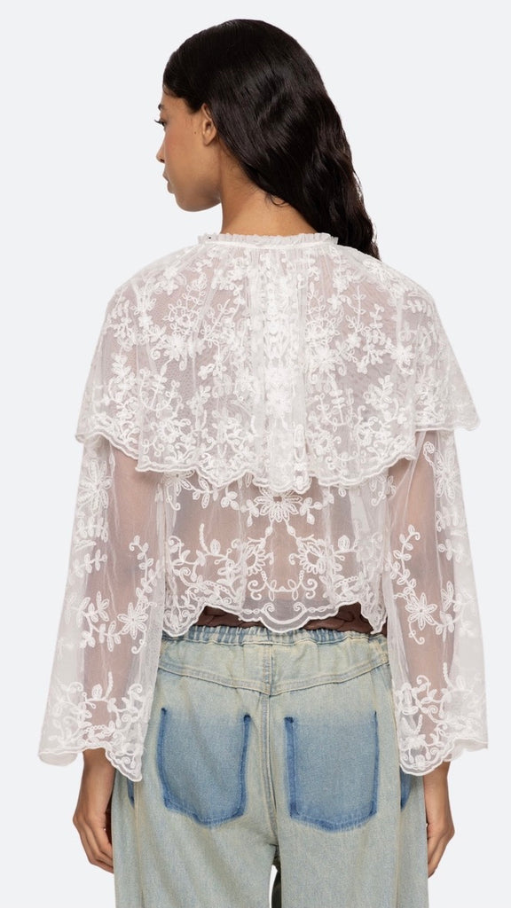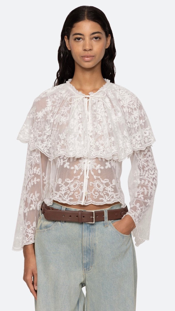 The Marja embroidered blouse features a delicate capelet, front tie closure, long flowing sleeves and floral embroidered mesh.