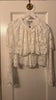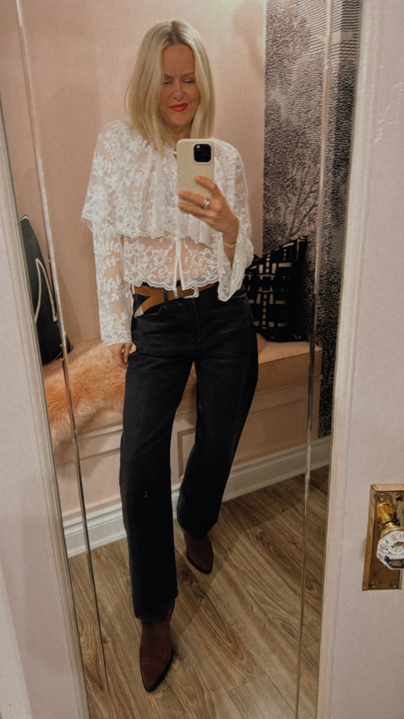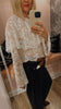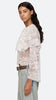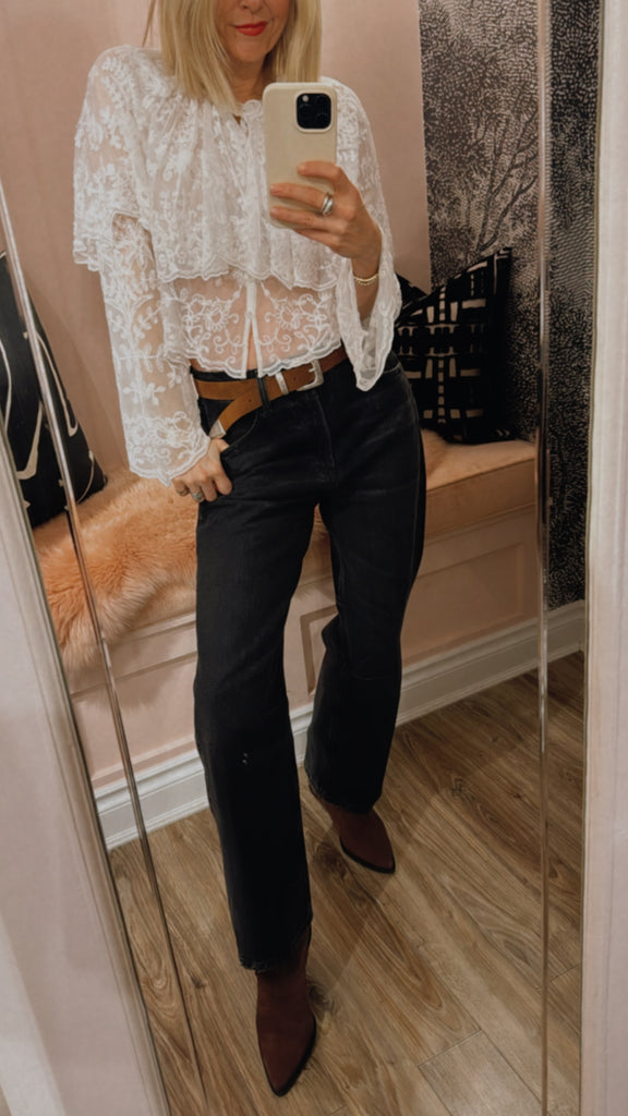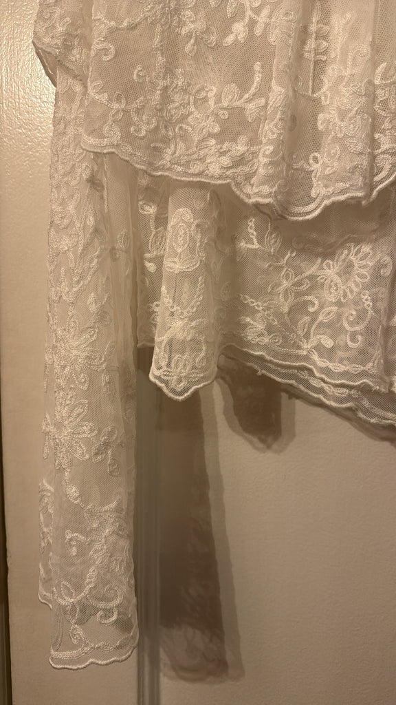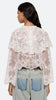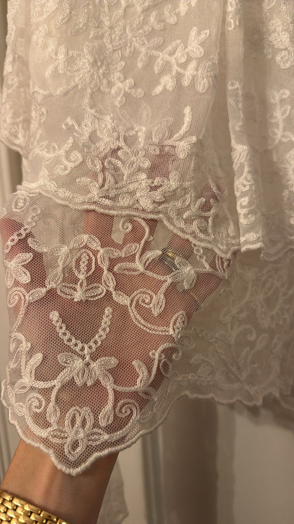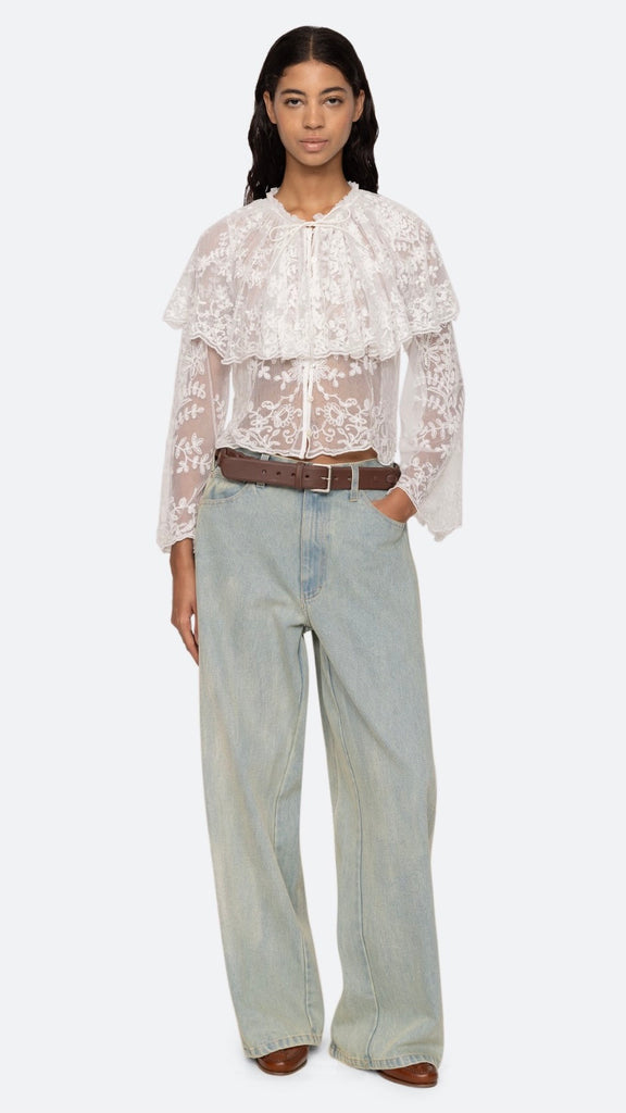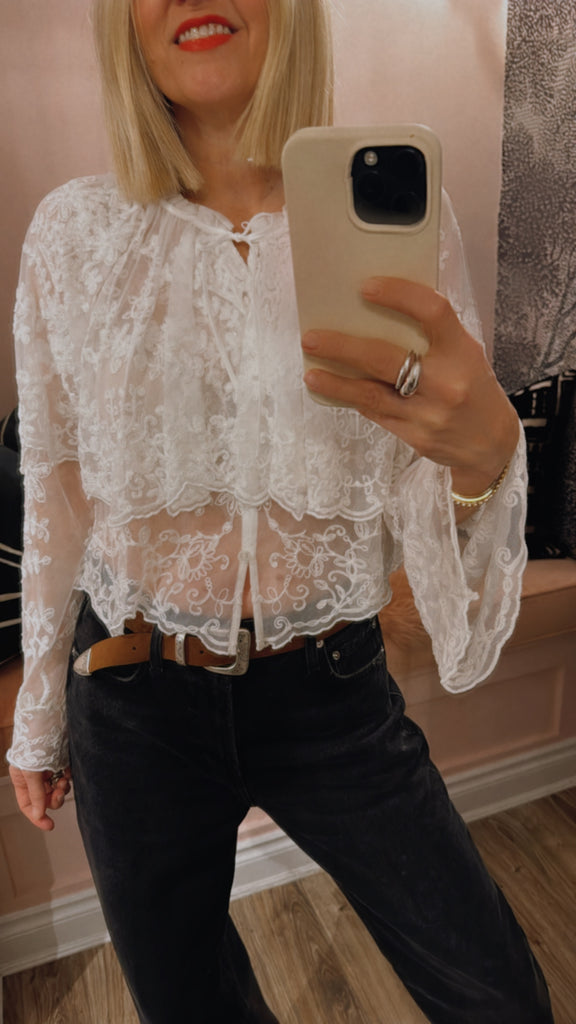 The Marja embroidered blouse features a delicate capelet, front tie closure, long flowing sleeves and floral embroidered mesh.