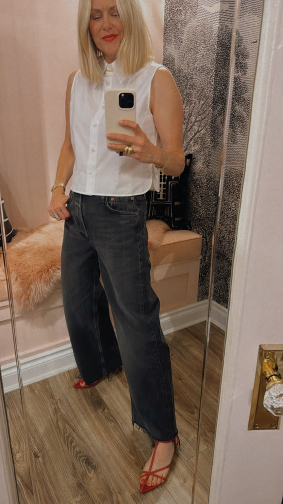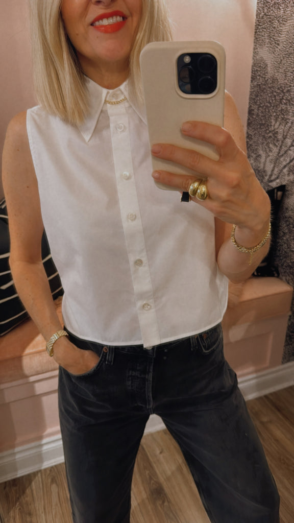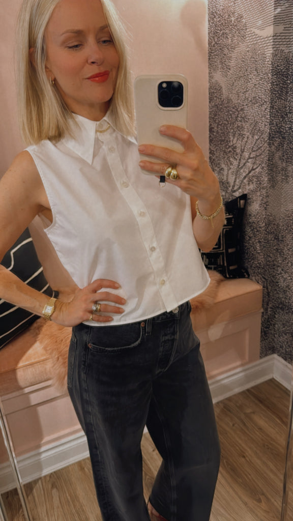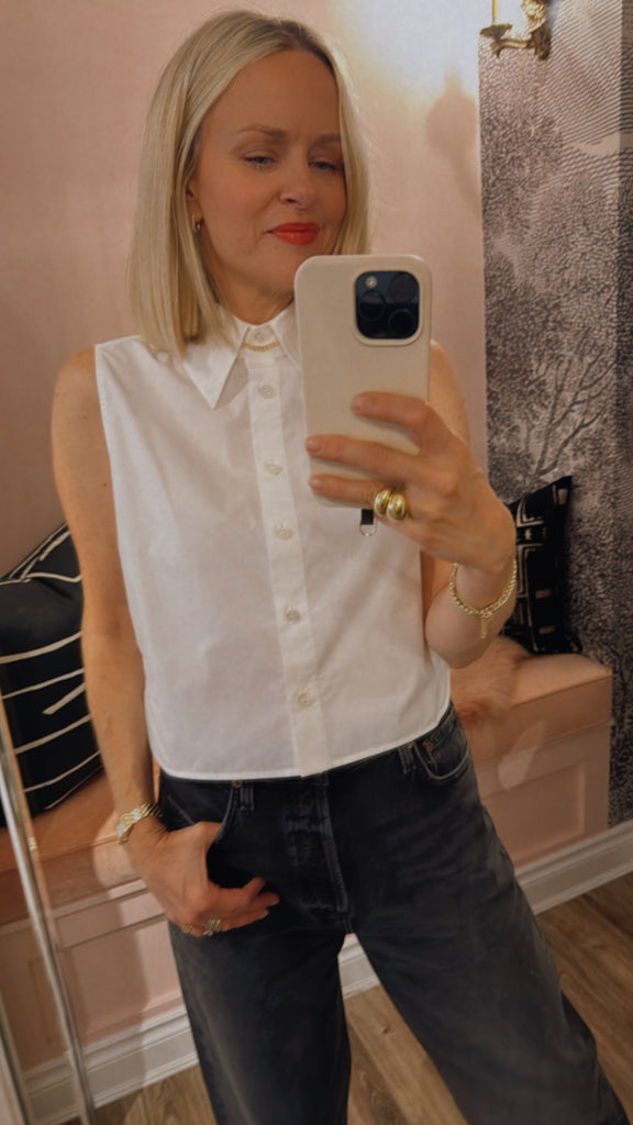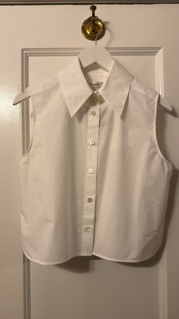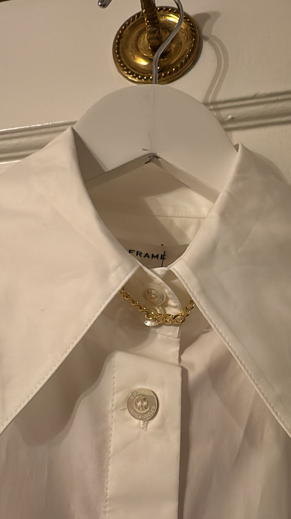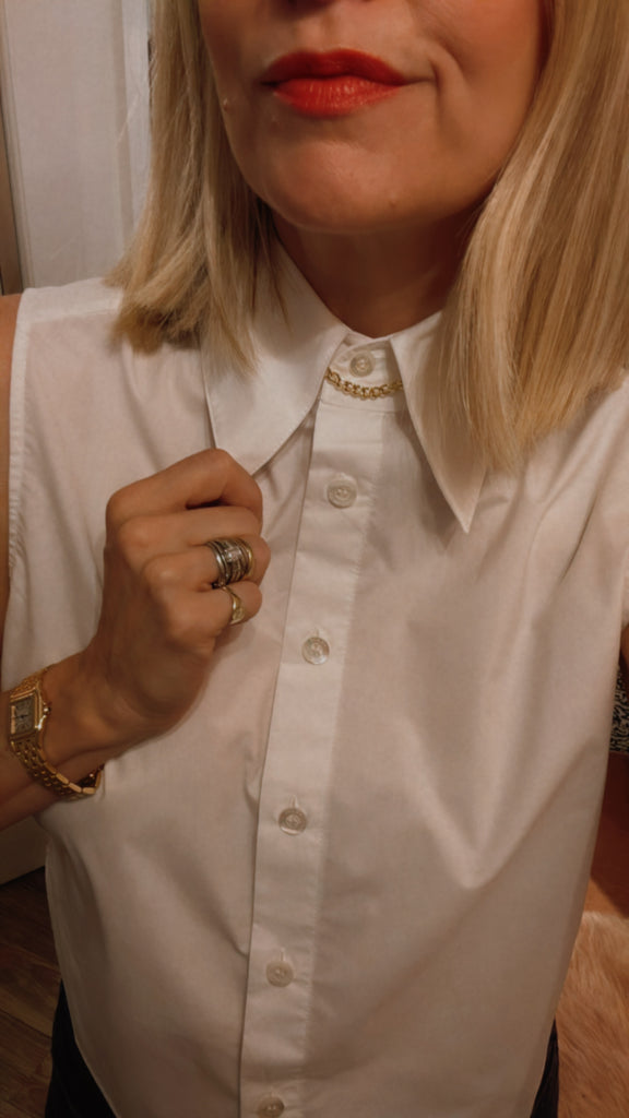 This cotton poplin shell is a modern take on a classic, set apart by a removable gold chain at the neckline for a subtle, vintage-inspired accent. It has a shirttail hem, back pleating and an elongated collar.