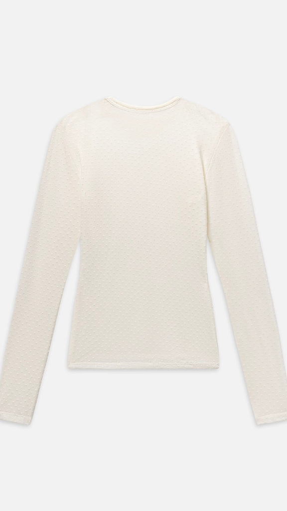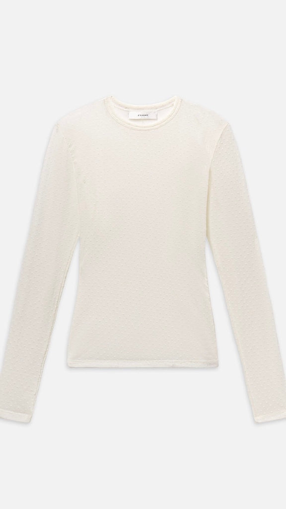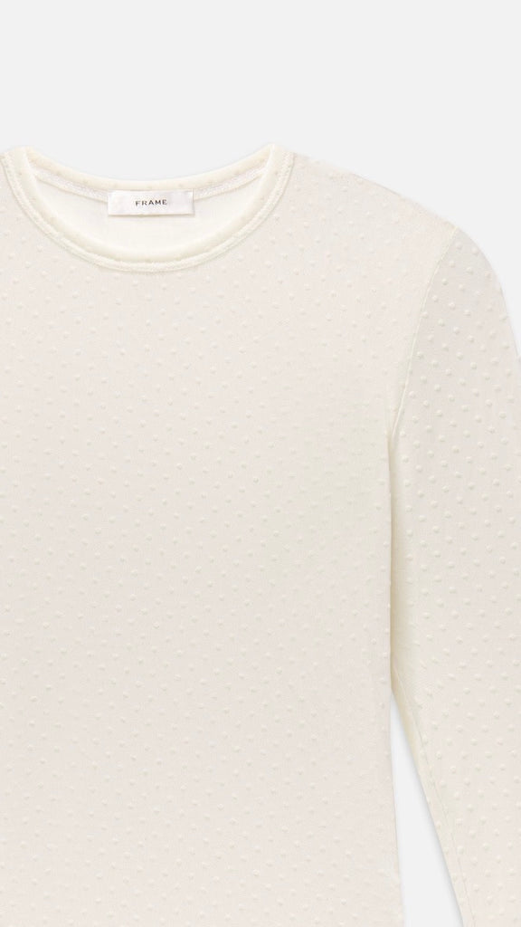 A FRAME team favorite from the latest collection, this sheer, form-fitting top features all-over matte polka dots. Polished with a playful side, The Mesh Polka Dot top makes the perfect layering piece.