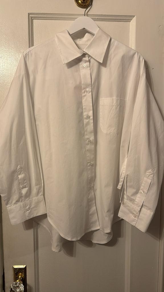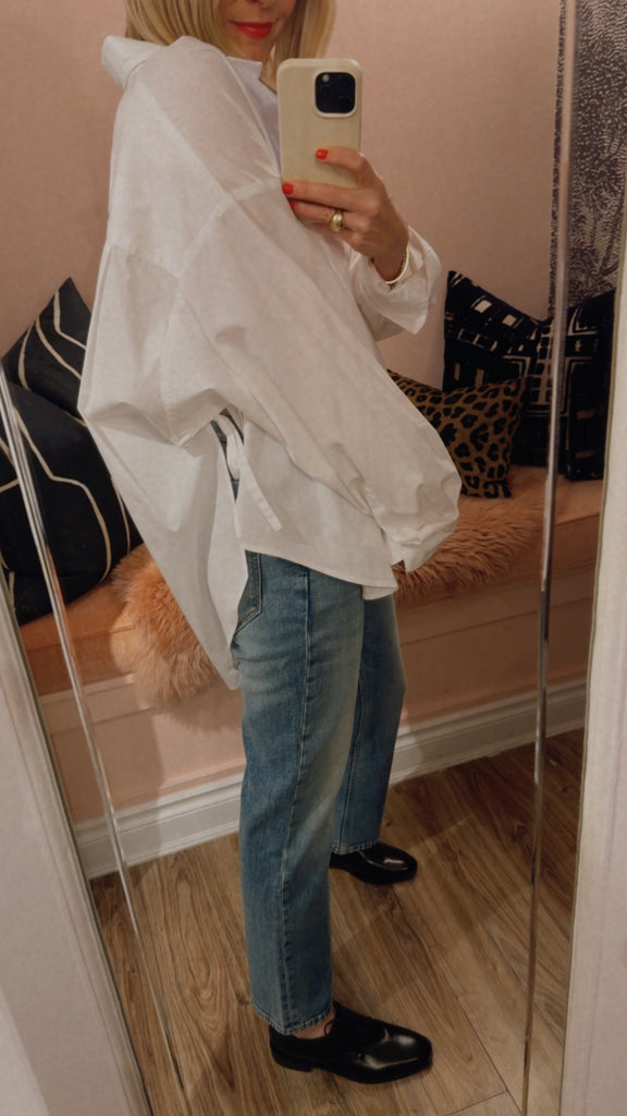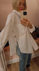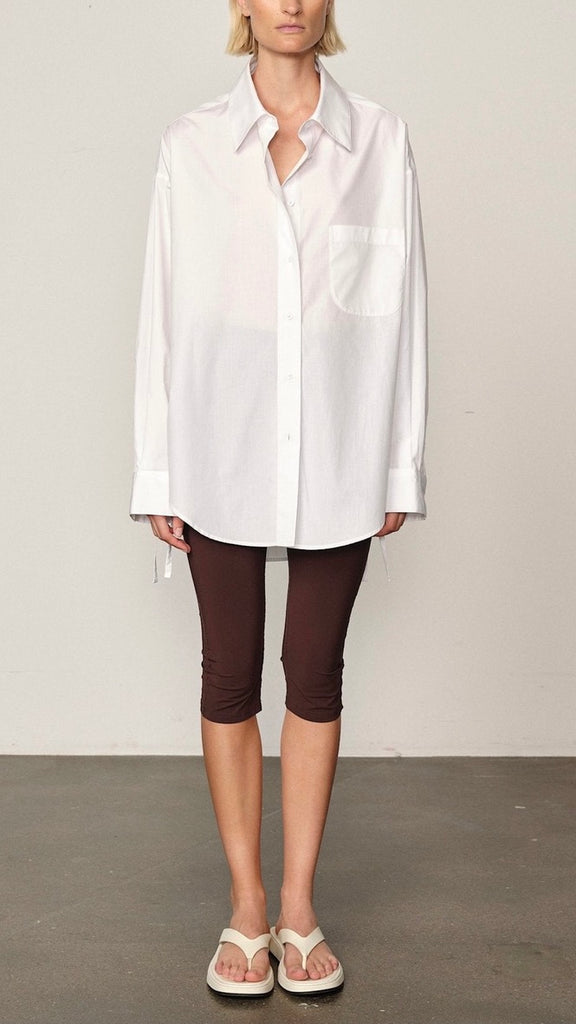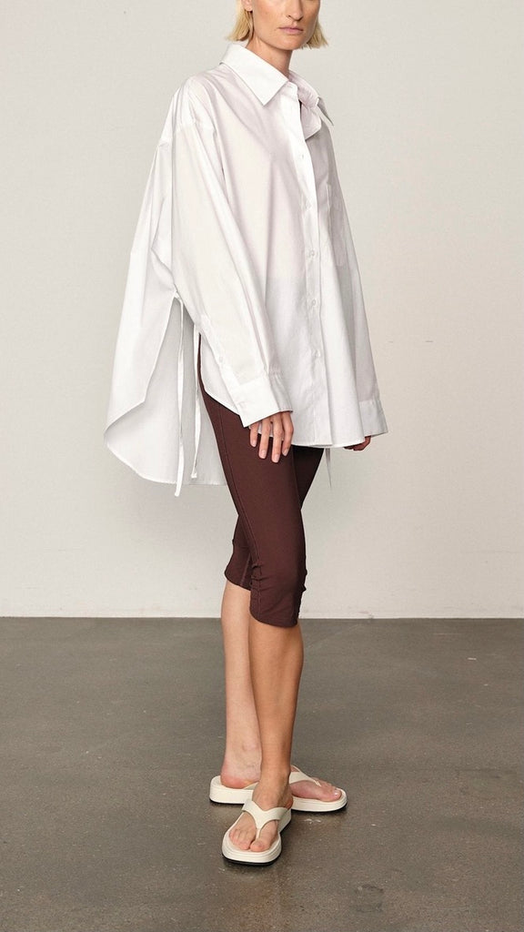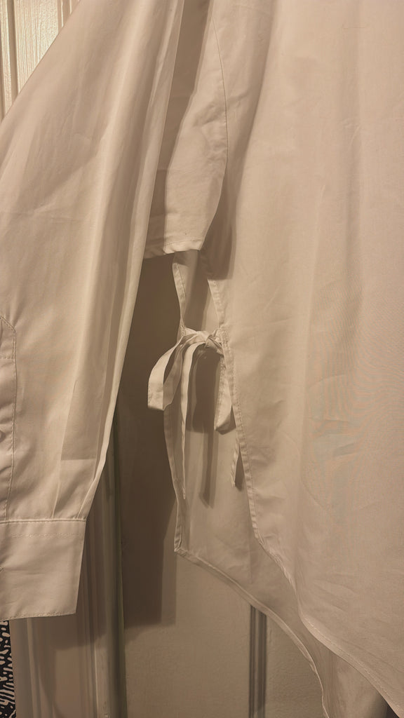 Cut to a relaxed, sculptural silhouette with dropped shoulders and a curved hem. Features side slits and adjustable back ties that allow for versatile styling — cinched at the waist or worn loose for an effortless shape.