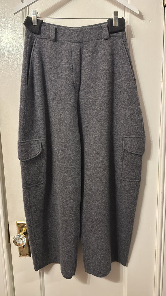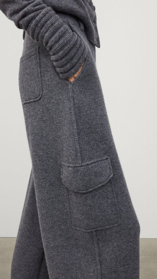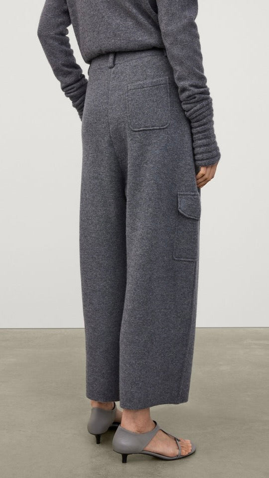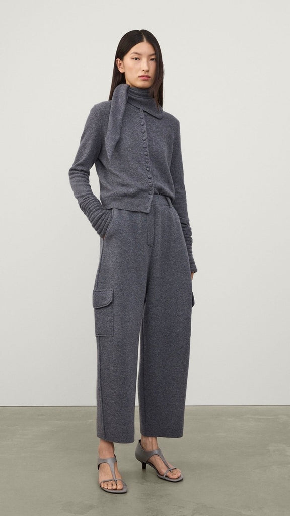 A knitted cargo trouser, the Azaria trouser is crafted in our signature knitted double face cashmere for directional structure. The relaxed fit, barrel silhouette sits comfortably at the waist with an elasticated waistband and falls to voluminous full-length legs that taper at the ankles. It is detailed with a tailoring-inspired faux fly and belt loops and finished with utility-inspired patch pockets.