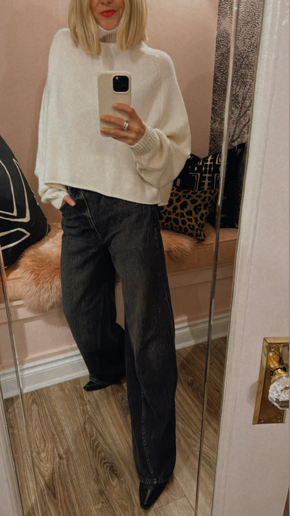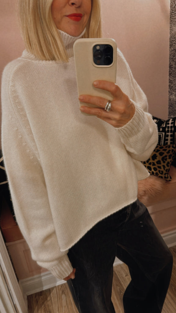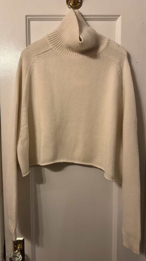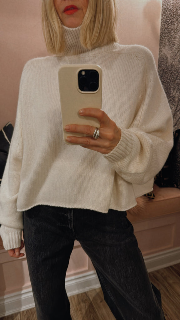 A piece with modern proportions, the Cathie sweater is crafted in Lisa's signature plain knit cashmere with a rich hand feel. The relaxed fit, wide silhouette creates gentle drapes along the front and back and features an enveloping high neck, elongated raglan sleeves, ribbed trims and a cropped hem.